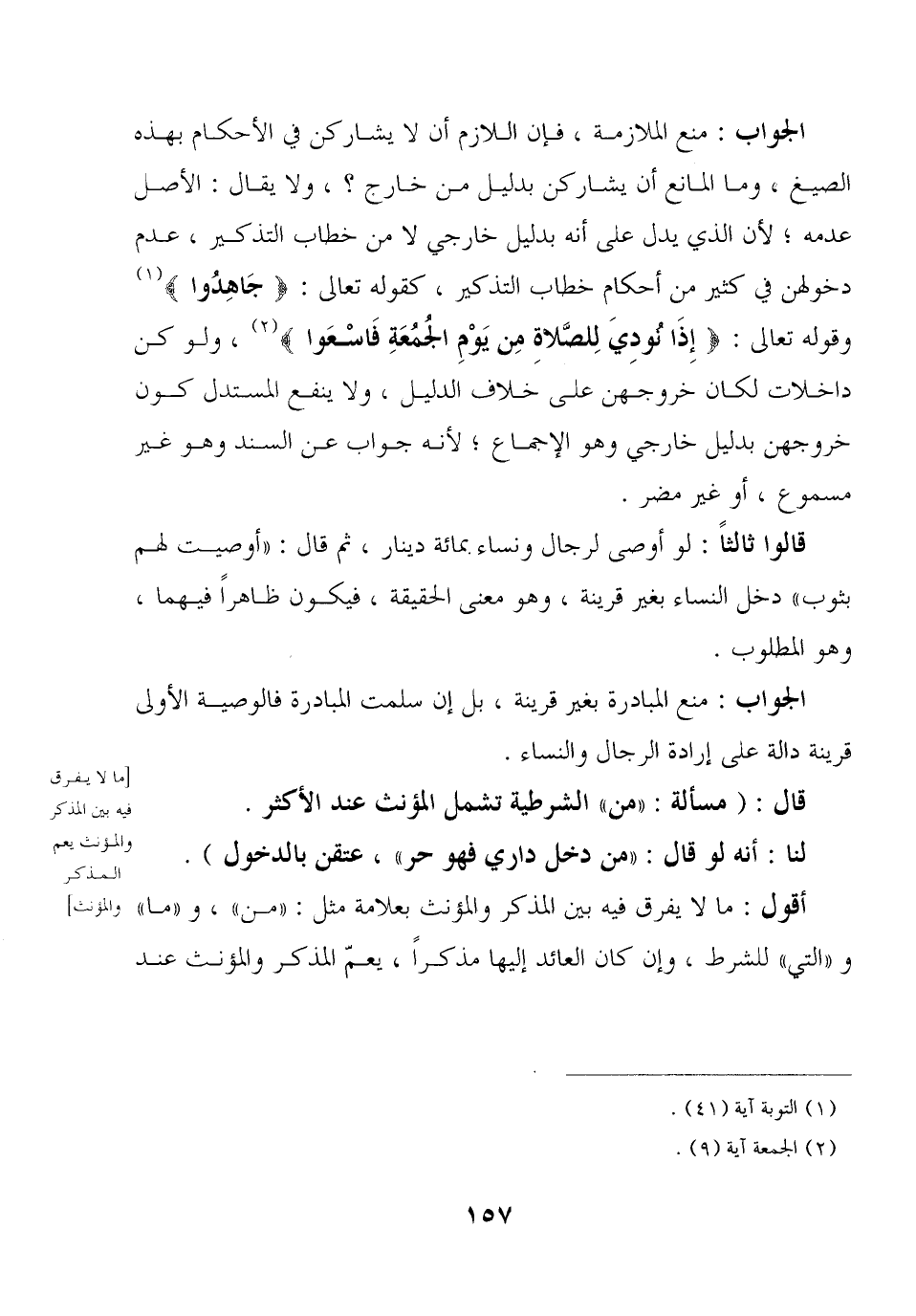 الجواب: منع الملازمة, فإن اللازم أن لا يشاركن في الأحكام بهذه الصيغ, ومع المانع أن يشاركن بدليل من خارج؟ , ولا يقال: الأصل عدمه؛ لأن الذي يدل على أنه بدليل خارجي لا من خطاب التذكير, عدم دخولهن في كثير من أحكام خطاب التذكير, كقوله تعالى: {جاهدوا} وقوله تعالى: {إذا نودي للصلاة من يوم الجمعة فاسعوا} , ولو كن داخلات لكان خروجهن على خلاف الدليل, ولا ينفع المستدل كون خروجهن بدليل خارجي وهو الإجماع؛ لأنه جواب عن السند وهو غير مسموع, أو غير مضر.