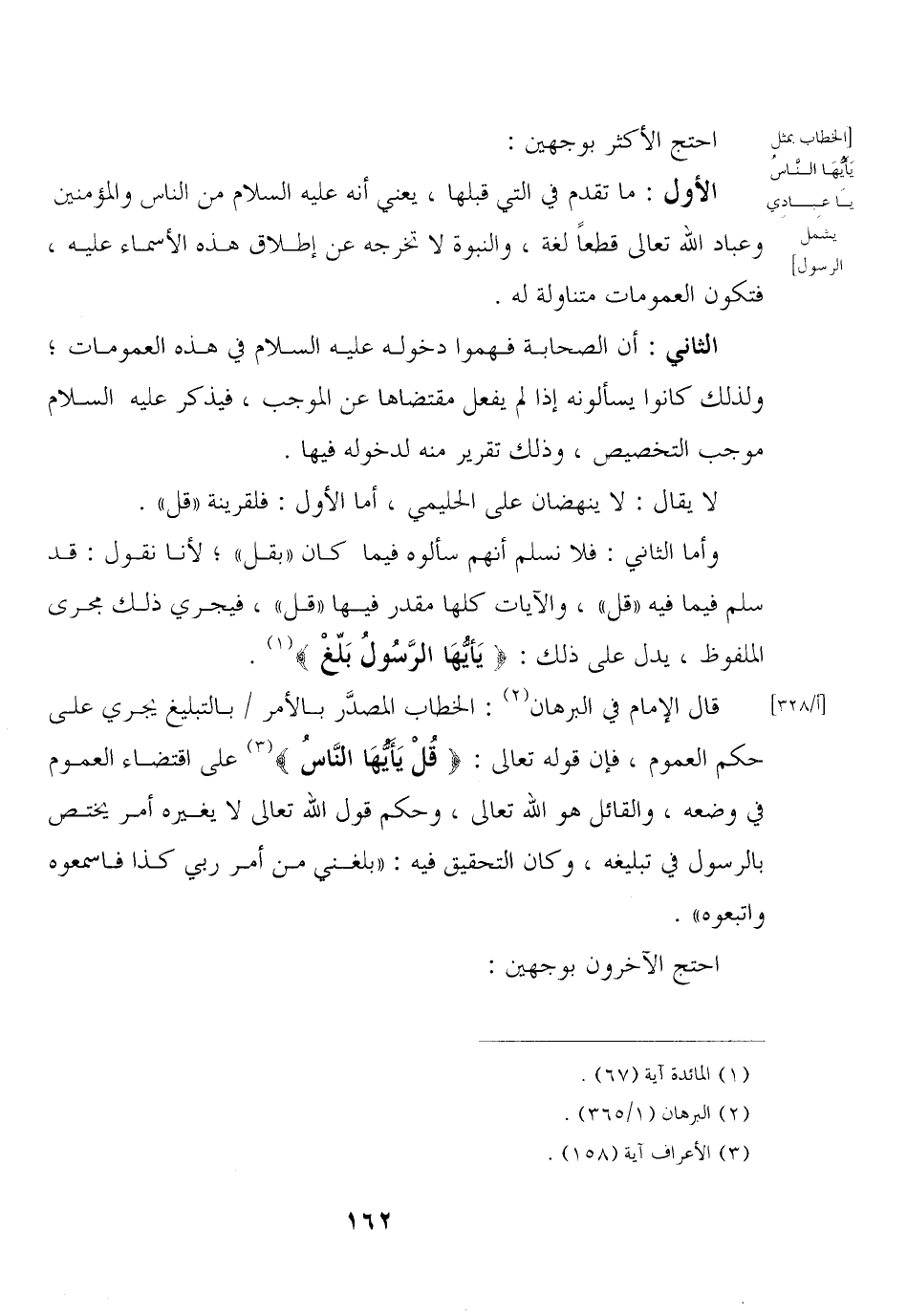 قال الإمام في البرهان: الخطاب المصدَّر بالأمر / بالتبليغ يجري على حكم العموم, فإن قوله تعالى: {قل يأيها الناس} على اقتضاء العموم في وضعه, والقائل هو الله تعالى, وحكم قول الله تعالى لا يغيره أمر يختص بالرسول في تبليغه, وكان التحقيق فيه: «بلغني من أمر ربي كذا فاسمعوه واتبعوه».