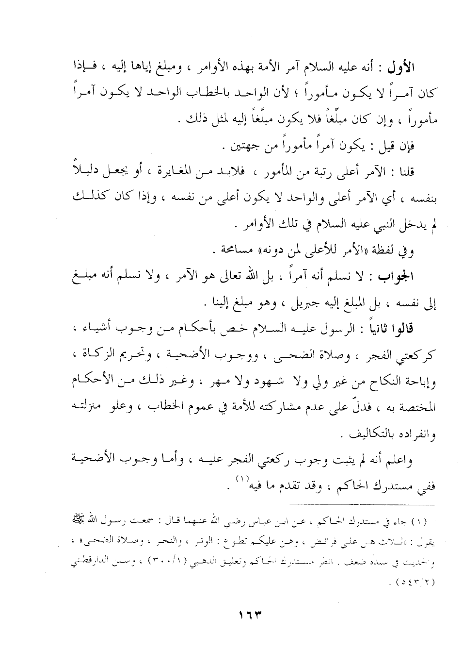 قالوا ثانيًا: الرسول عليه السلام خص بأحكام من وجوب أشياء, كركعتي الفجر, وصلاة الضحى, ووجوب الأضحية, وتحريم الزكاة, وإباحة النكاح من غير ولي ولا شهود ولا مهر, وغير ذلك من الأحكام المختصة به, فدلّ على عدم مشاركته للأمة في عموم الخطاب, وعلو منزلته وانفراده بالتكاليف.