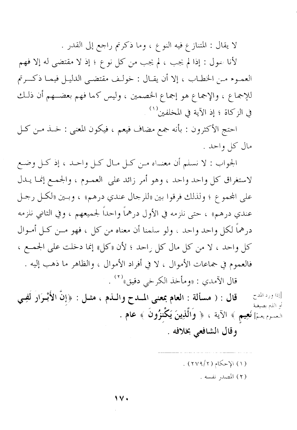 قال: (مسألة: العام بمعنى المدح والذم, مثل: {إن الأبرار لفي نعيم} الآية, {والذين يكنزون} عام.