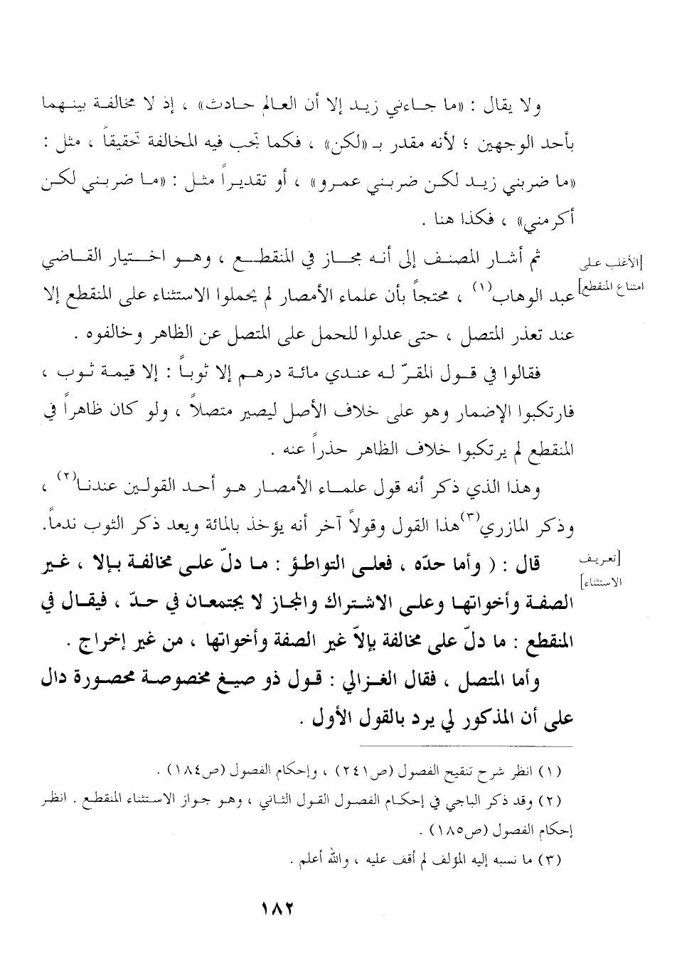 ثم أشار المصنف إلى أنه مجاز في المنقطع, وهو اختيار القاضي عبد الوهاب, محتجًا بأن علماء الأمصار لم يحملوا الاستثناء على المنقطع إلا عند تعذر المتصل, حتى عدلوا للحمل على المتصل عن الظاهر وخالفوه.