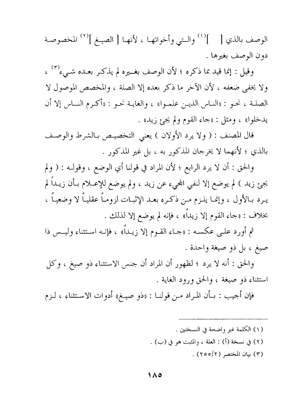 وقيل: إنما قيد بما ذكره؛ لأن الوصف بغيره لم يذكر بعده شيء, ولا يخفى ضعفه, لأن الآخر ما ذكر بعده إلا الصلة, والمخصص الموصول لا الصلة, نحو: «الناس الذين علموا» , والغاية نحو: «أكرم الناس إلا أن يدخلوا» , ومثل: «جاء القوم ولم يجئ زيد».
