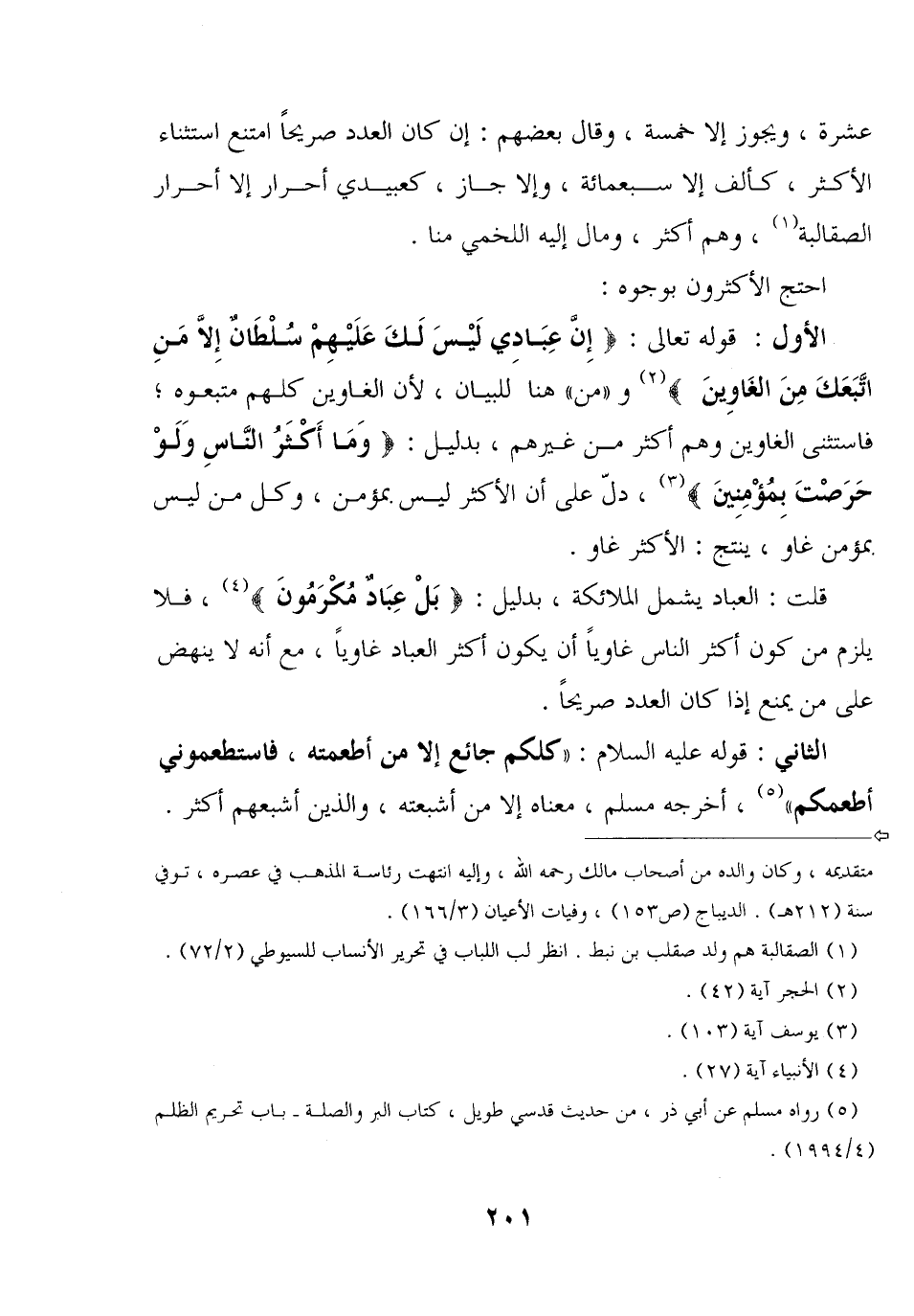 الأول: قوله تعالى: {إن عبادي ليس لك عليهم سلطان إلا من اتبعك من الغاوين} و «من» هنا للبيان, لأن الغاوين كلهم متبعوه؛ فاستثنى الغاوين وهم أكثر من غيرهم, بدليل: {وما أكثر الناس ولو حرصت بمؤمنين} , دلّ على أن الأكثر ليس بمؤمن, وكل من ليس بمؤمن غاو, ينتج: الأكثر غاو.