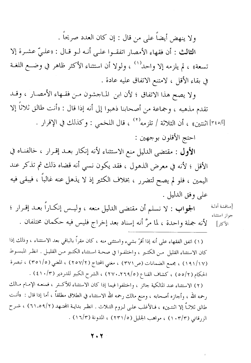 الثالث: أن فقهاء الأمصار اتفقوا على أنه لو قال: «عليّ عشرة إلا تسعة» , لم يلزمه إلا واحد, ولولا أن استثناء الأكثر ظاهر في وضع اللغة في بقاء الأقل, لامتنع الاتفاق عليه عادة.