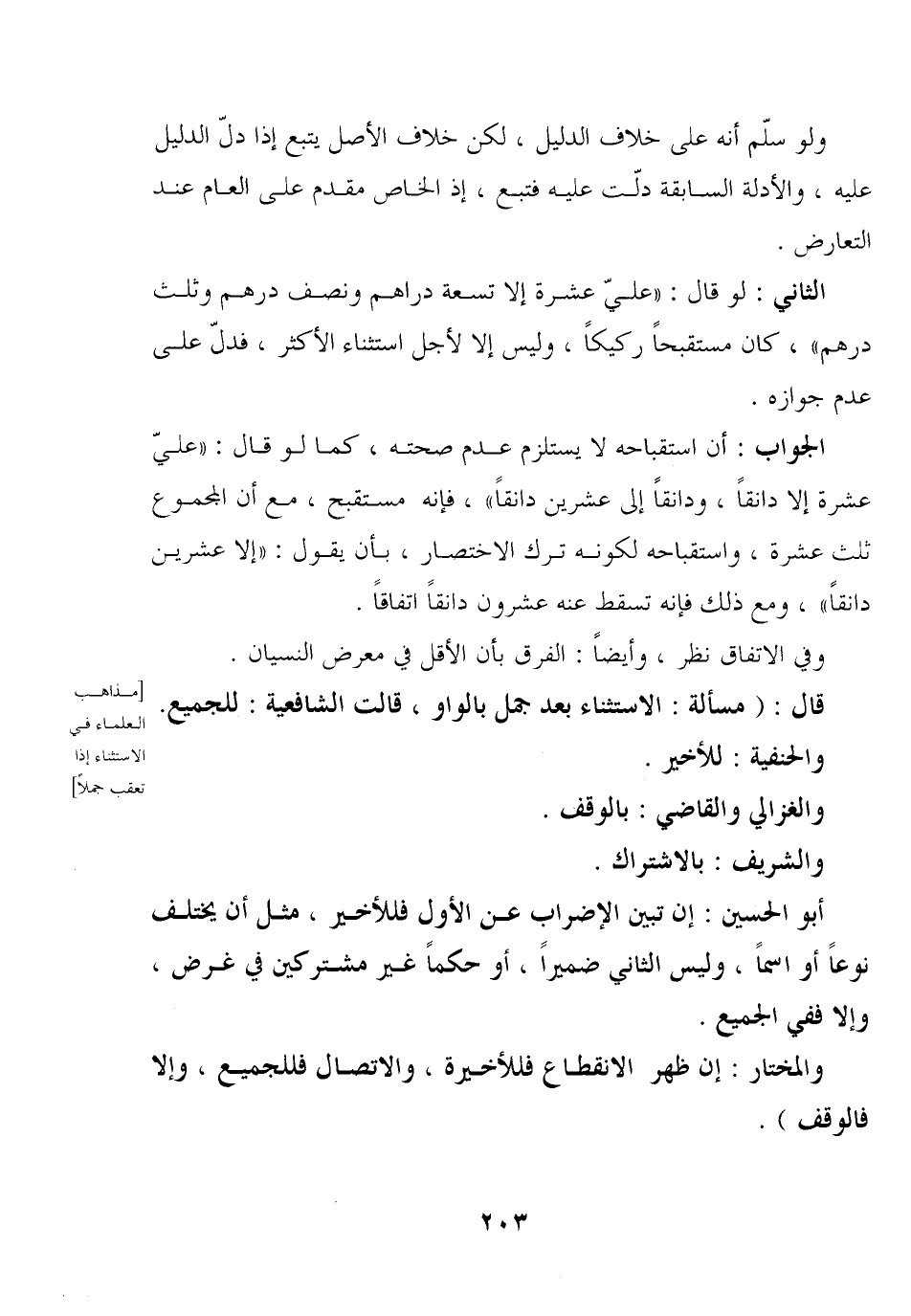 الثاني: لو قال: «عليّ عشرة إلا تسعة دراهم ونصف درهم وثلث درهم» , كان مستقبحًا ركيكًا, وليس إلا لأجل استثناء الأكثر, فدلّ على عدم جوازه.