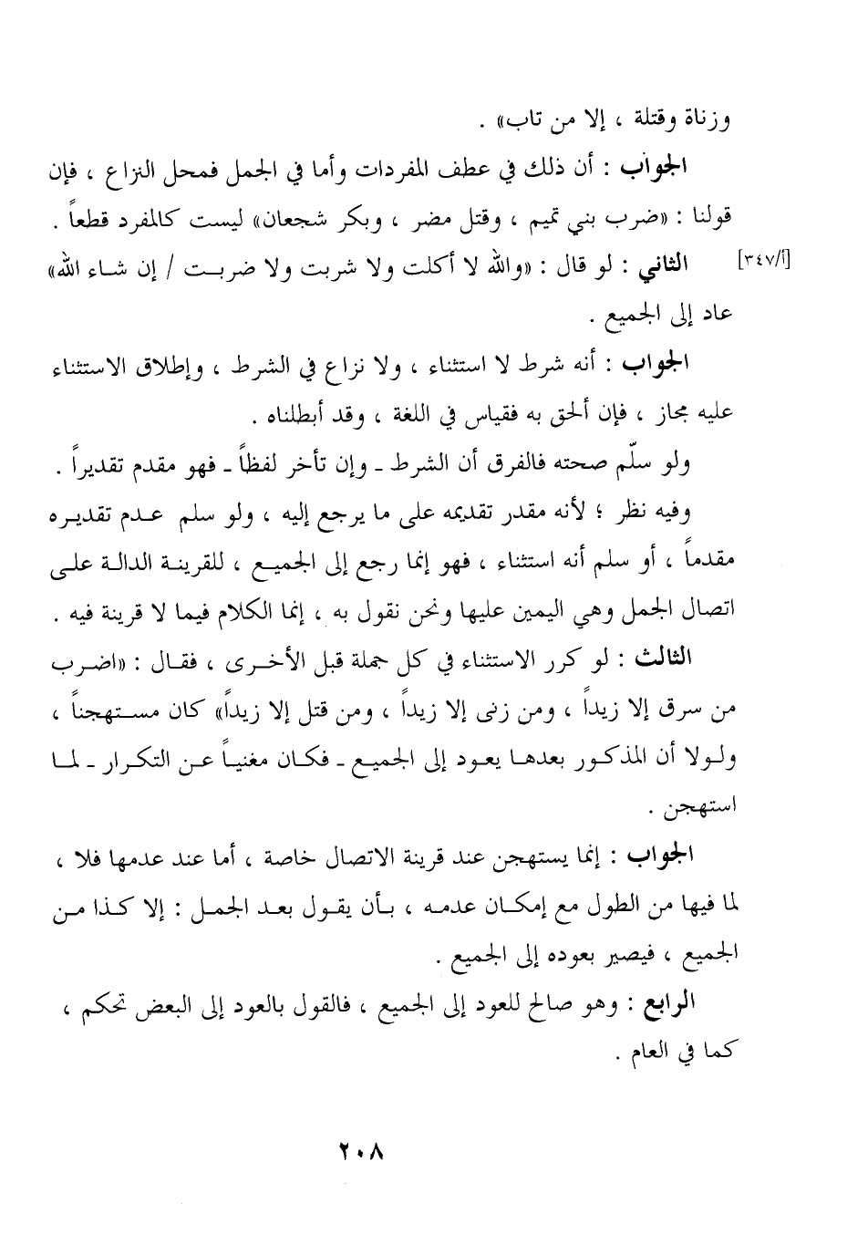 الثالث: لو كرر الاستثناء في كل جملة قبل الأخرى, فقال: «اضرب من سرق إلا زيدًا, ومن زنى إلا زيدًا, ومن قتل إلا زيدًا» كان مستهجنًا, ولولا أن المذكور بعدها يعود إلى الجميع - فكان مغنيًا عن التكرار - لما استهجن.