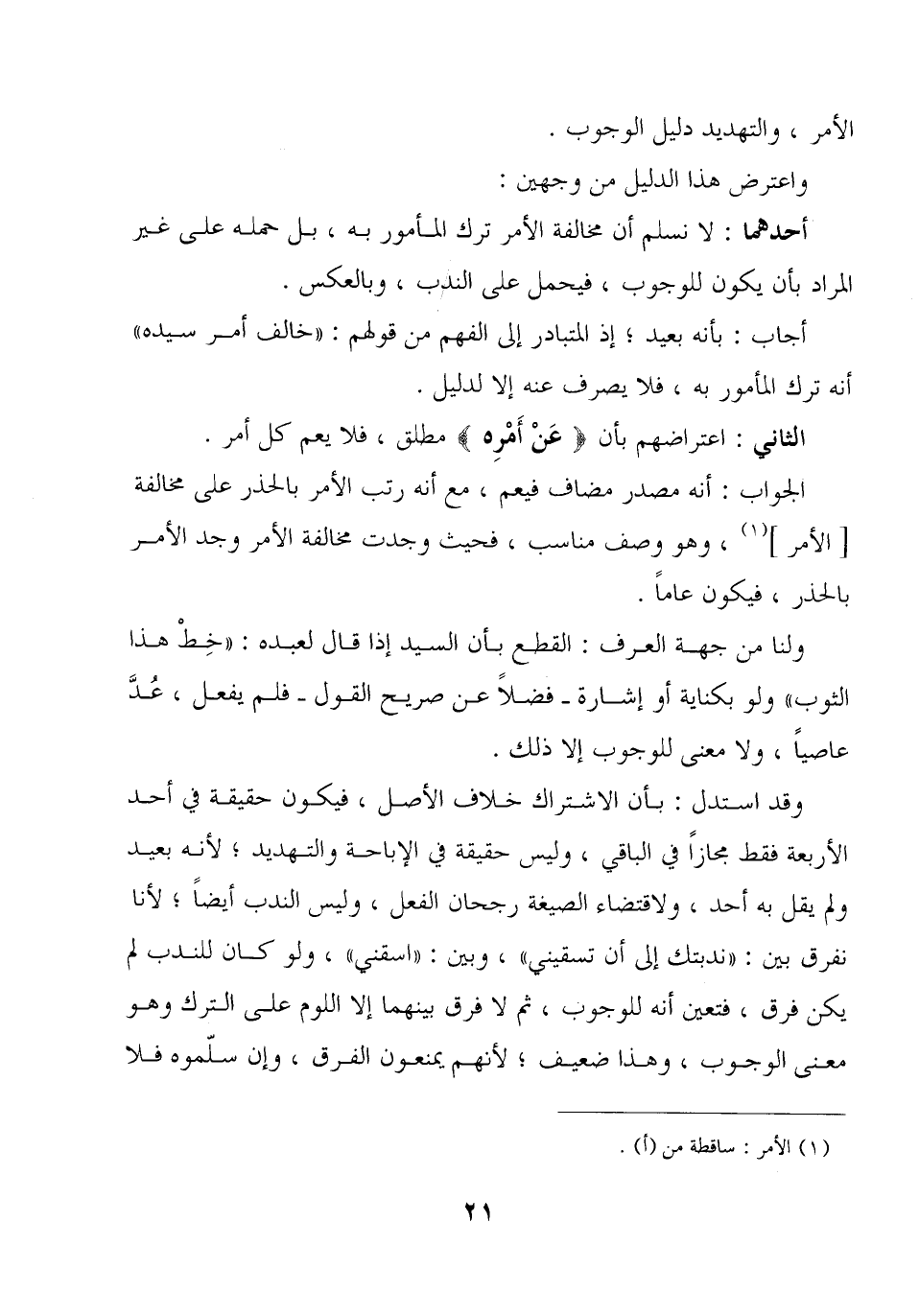 الثاني: اعتراضهم بأن {عن أمره} مطلق, فلا يعم كل أمر.