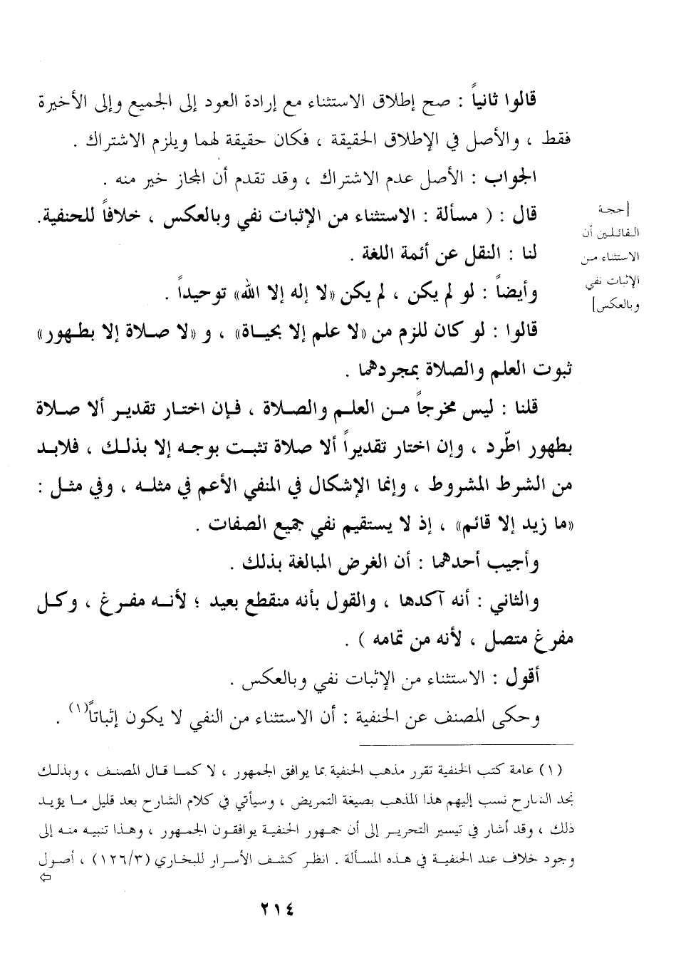 وحكى المصنف عن الحنفية: أن الاستثناء من النفي لا يكون إثباتًا.