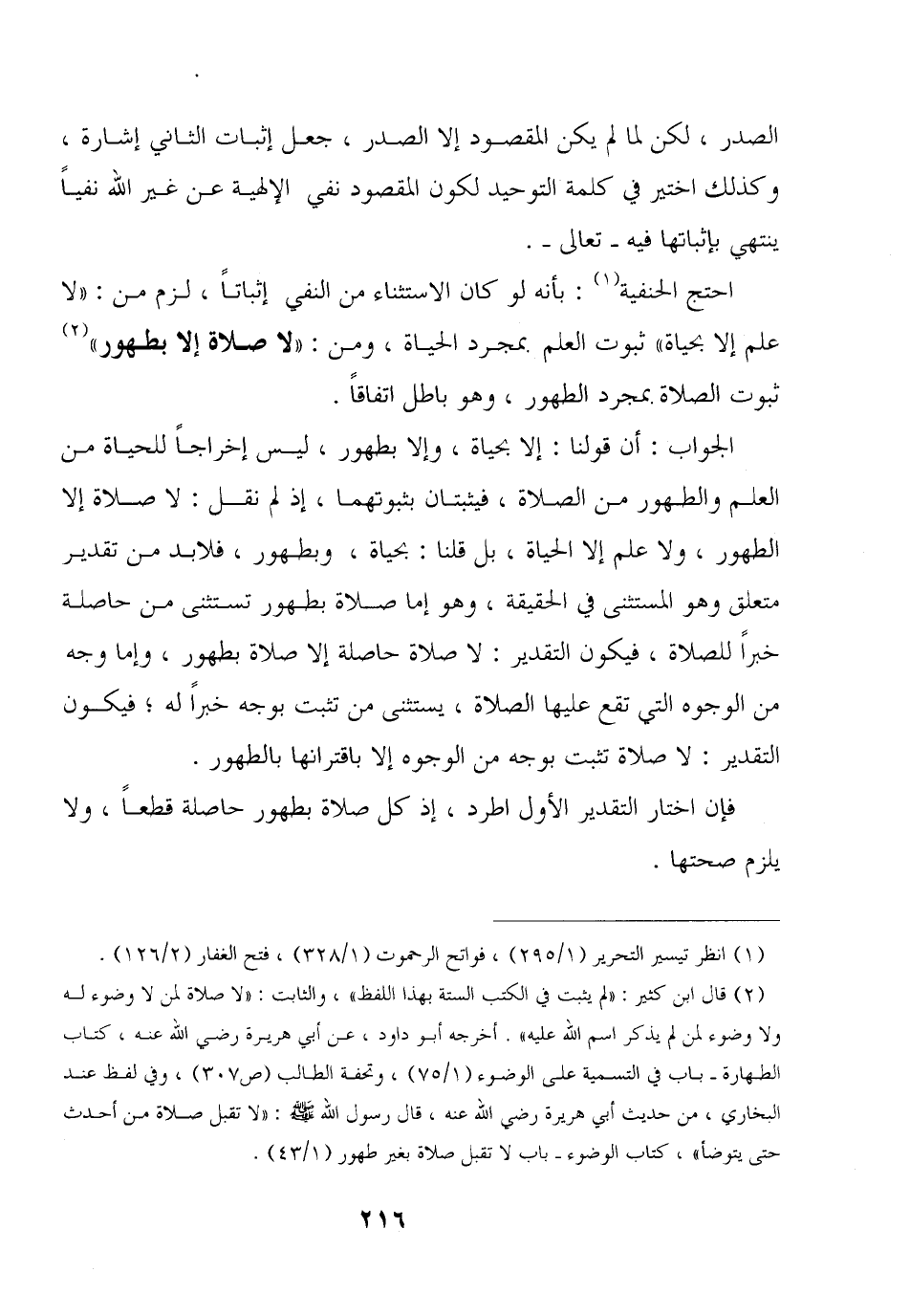 الجواب: أن قولنا: إلا بحياة, وإلا بطهور, ليس إخراجًا للحياة من العلم والطهور من الصلاة, فيثبتان بثبوتهما, إذ لم نقل: لا صلاة إلا الطهور, ولا علم إلا الحياة, بل قلنا: بحياة, وبطهور, فلابد من تقدير متعلق وهو المستثنى في الحقيقة, وهو إما صلاة بطهور تستثنى من حاصلة خبرًا للصلاة, فيكون التقدير: لا صلاة حاصلة إلا صلاة بطهور, وإما وجه من الوجوه التي تقع عليها الصلاة, يستثنى من تثبت بوجه خبرًا له؛ فيكون التقدير: لا صلاة تثبت بوجه من الوجوه إلا باقترانها بالطهور.
