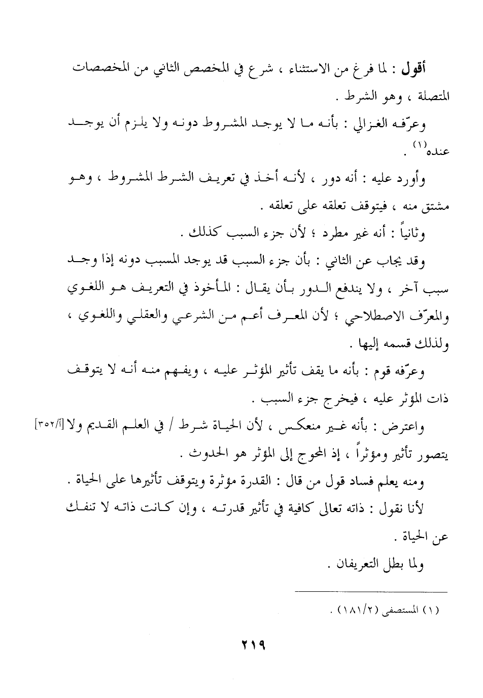 وعرّفه الغزالي: بأنه ما لا يوجد المشروط دونه ولا يلزم أن يوجد عنده.