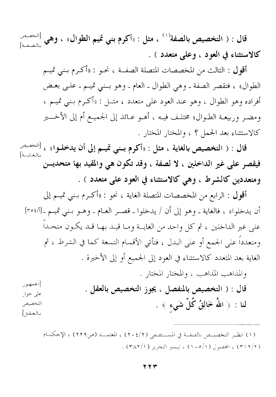 قال: (التخصيص بالصفة, مثل: «أكرم بني تميم الطوال» , وهي كالاستثناء في العود, وعلى متعدد).