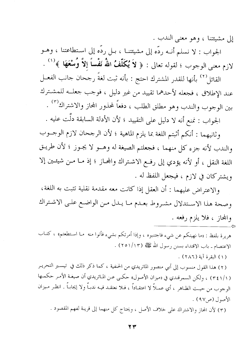 الجواب: لا نسلم أنه ردّه إلى مشيئتنا, بل ردّه إلى استطاعتنا, وهو لازم معنى الوجوب؛ لقوله تعالى: {لا يكلف الله نفسًا إلا وسعها}.