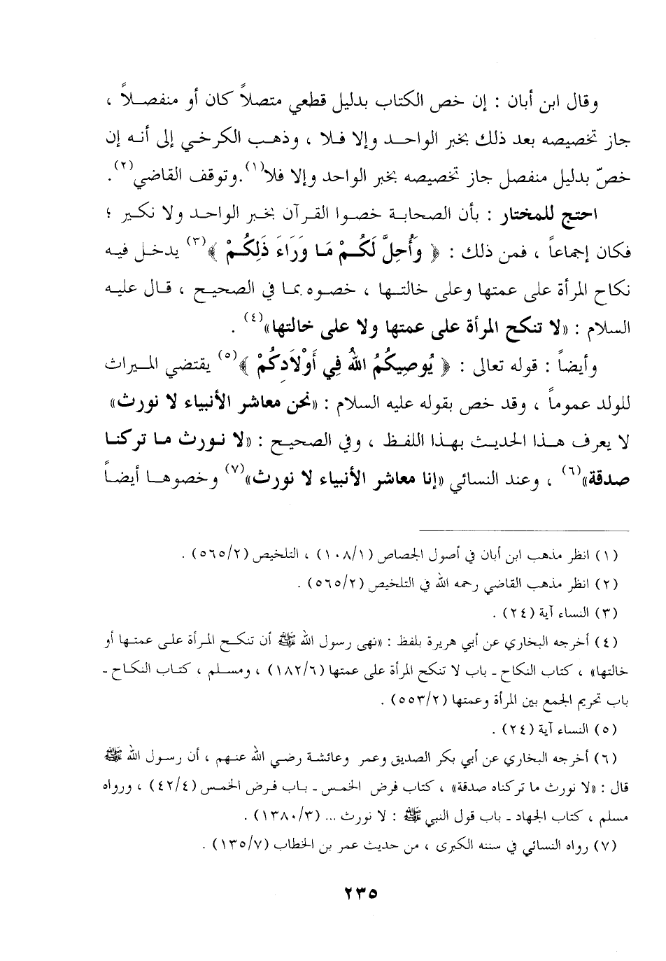 وقال ابن أبان: إن خص الكتاب بدليل قطعي متصلًا كان أو منفصلًا, جاز تخصيصه بعد ذلك بخبر الواحد وإلا فلا, وذهب الكرخي إلى أنه إن خصّ بدليل منفصل جاز تخصيصه بخبر الواحد وإلا فلا. وتوقف القاضي. احتج للمختار: بأن الصحابة خصوا القرآن بخبر الواحد ولا نكير؛ فكان إجماعًا, فمن ذلك: {وأحل لكم ما وراء ذلكم} يدخل فيه نكاح المرأة على عمتها وعلى خالتها, خصوه بما في الصحيح, قال عليه السلام: «لا تنكح المرأة على عمتها ولا على خالتها».