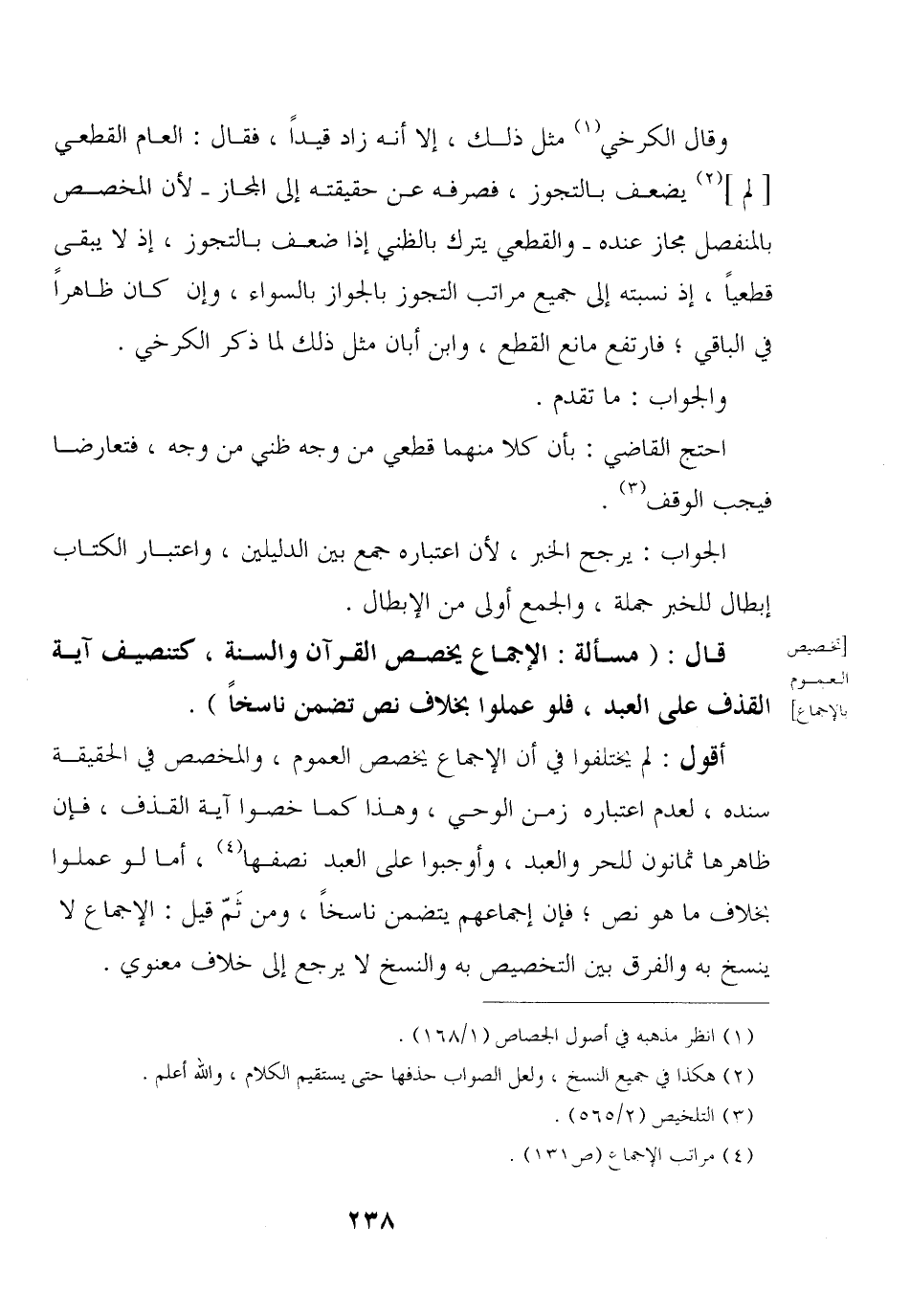 أقول: لم يختلفوا في أن الإجماع يخصص العموم, والمخصص في الحقيقة سنده, لعدم اعتباره زمن الوحي, وهذا كما خصوا آية القذف, فإن ظاهرها ثمانون للحر والعبد, وأوجبوا على العبد نصفها, أما لو عملوا بخلاف ما هو نص؛ فإن إجماعهم يتضمن ناسخًا, ومن ثَمّ قيل: الإجماع لا ينسخ به والفرق بين التخصيص به والنسخ لا يرجع إلى خلاف معنوي.
