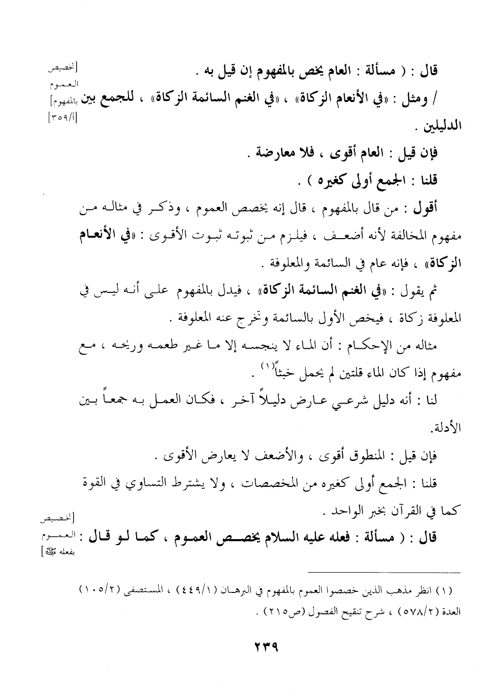أقول: من قال بالمفهوم, قال إنه يخصص العموم, وذكر في مثاله من مفهوم المخالفة لأنه أضعف, فيلزم من ثبوته ثبوت الأقوى: «في الأنعام الزكاة» , فإنه عام في السائمة والمعلوفة.