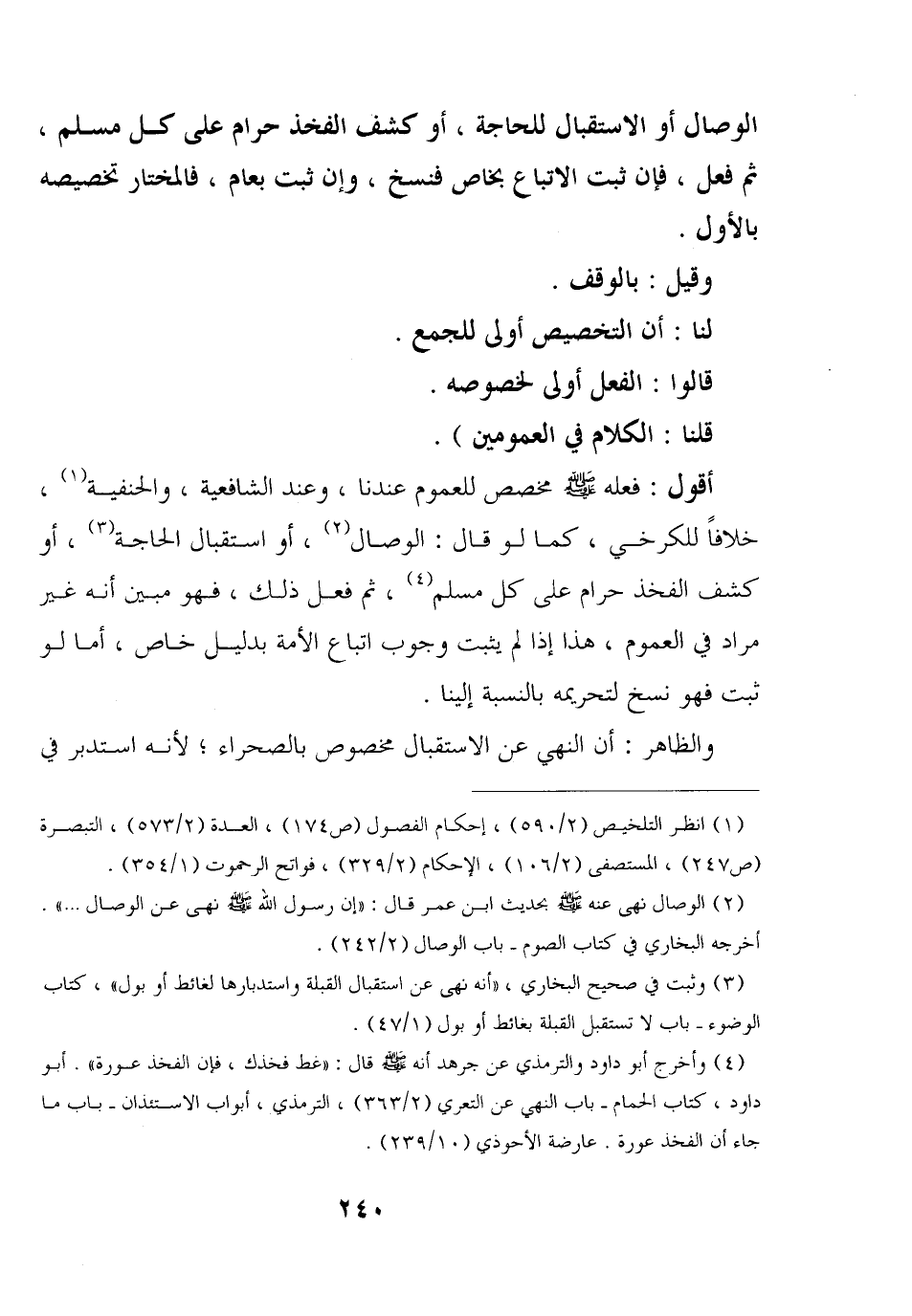 الوصال أو الاستقبال للحاجة, أو كشف الفخذ حرام على كل مسلم, ثم فعل, فإن ثبت الاتباع بخاص فنسخ, وإن ثبت بعام, فالمختار تخصيصه بالأول.