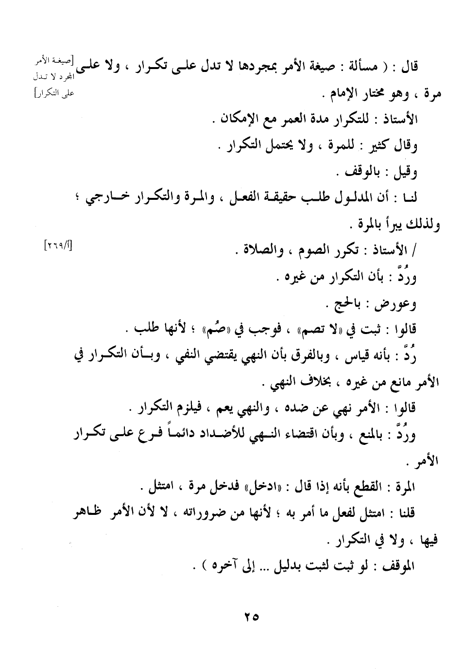 قال: (مسألة: صيغة الأمر بمجردها لا تدل على تكرار, ولا على مرة, وهو مختار الإمام.