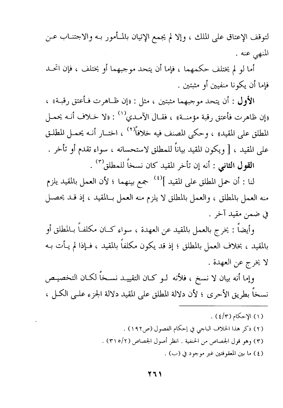 الأول: أن يتحد موجبهما مثبتين, مثل: «إن ظاهرت فأعتق رقبة» , «إن ظاهرت فأعتق رقبة مؤمنة» , فقال الآمدي: «لا خلاف أنه يحمل المطلق على المقيد» , وحكى المصنف فيه خلافًا, اختار أنه يحمل المطلق على المقيد, [ويكون المقيد بيانًا للمطلق لاستحسانه, سواء تقدم أو تأخر.