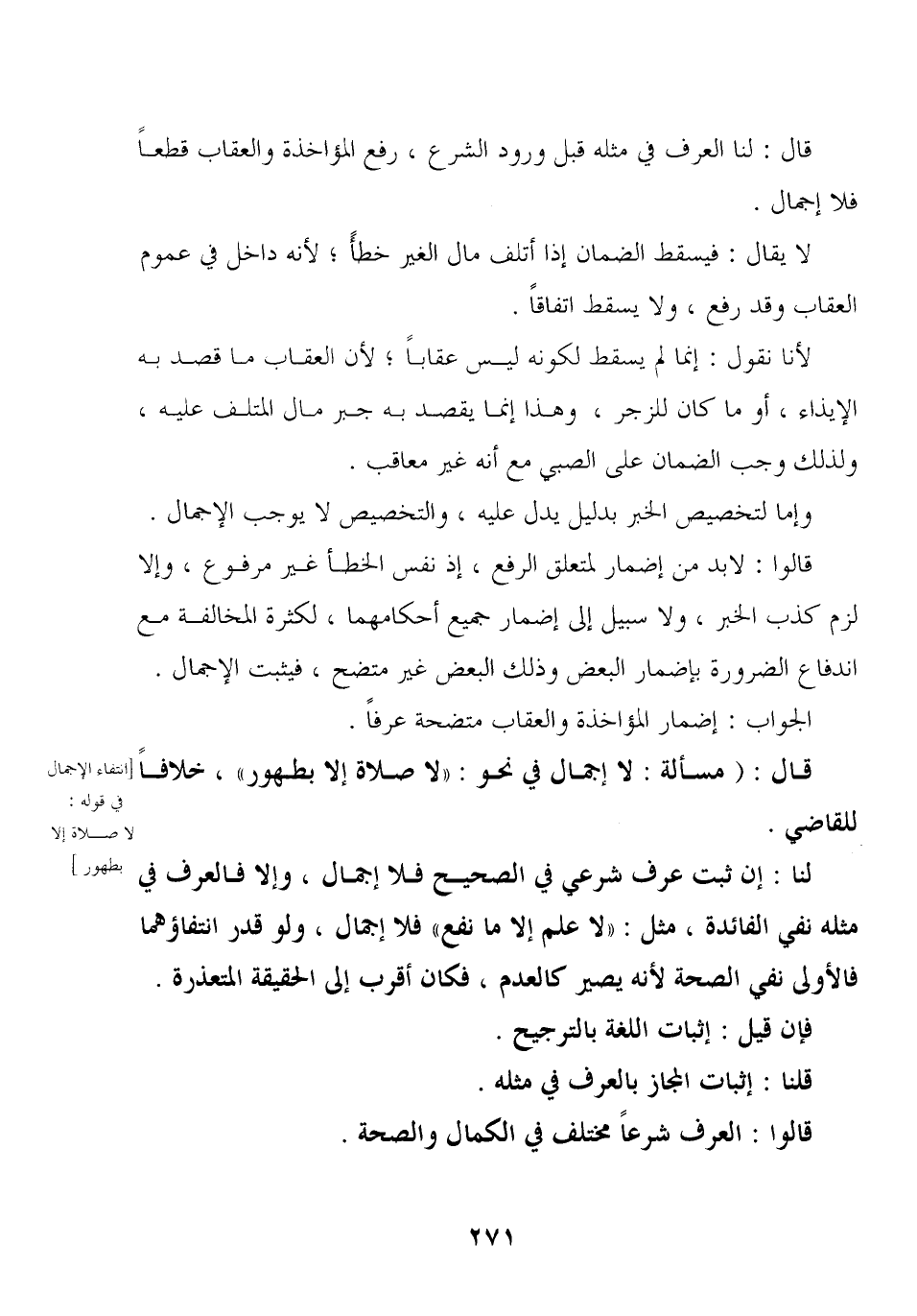 قال: (مسألة: لا إجمال في نحو: «لا صلاة إلا بطهور» , خلافًا للقاضي.