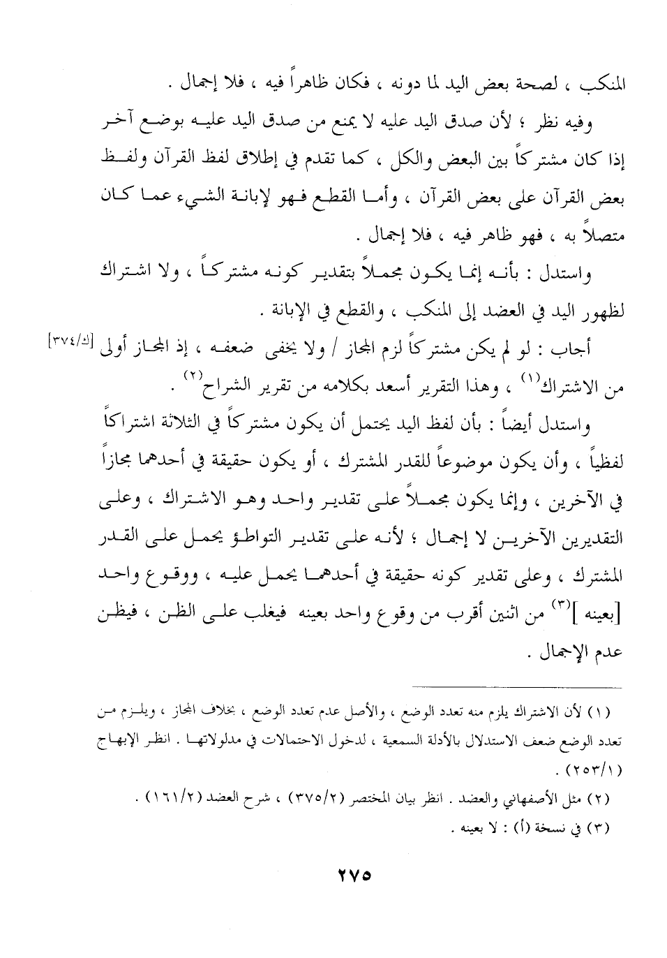 واستدل أيضًا: بأن لفظ اليد يحتمل أن يكون مشتركًا في الثلاثة اشتراكًا لفظيًا, وأن يكون موضوعًا للقدر المشترك, أو يكون حقيقة في أحدهما مجازًا في الآخرين, وإنما يكون مجملًا على تقدير واحد وهو الاشتراك, وعلى التقديرين الآخرين لا إجمال؛ لأنه على تقدير التواطؤ يحمل على القدر المشترك, وعلى تقدير كونه حقيقة في أحدهما يحمل عليه, ووقوع واحد [بعينه] من اثنين أقرب من وقوع واحد بعينه فيغلب على الظن, فيظن عدم الإجمال.
