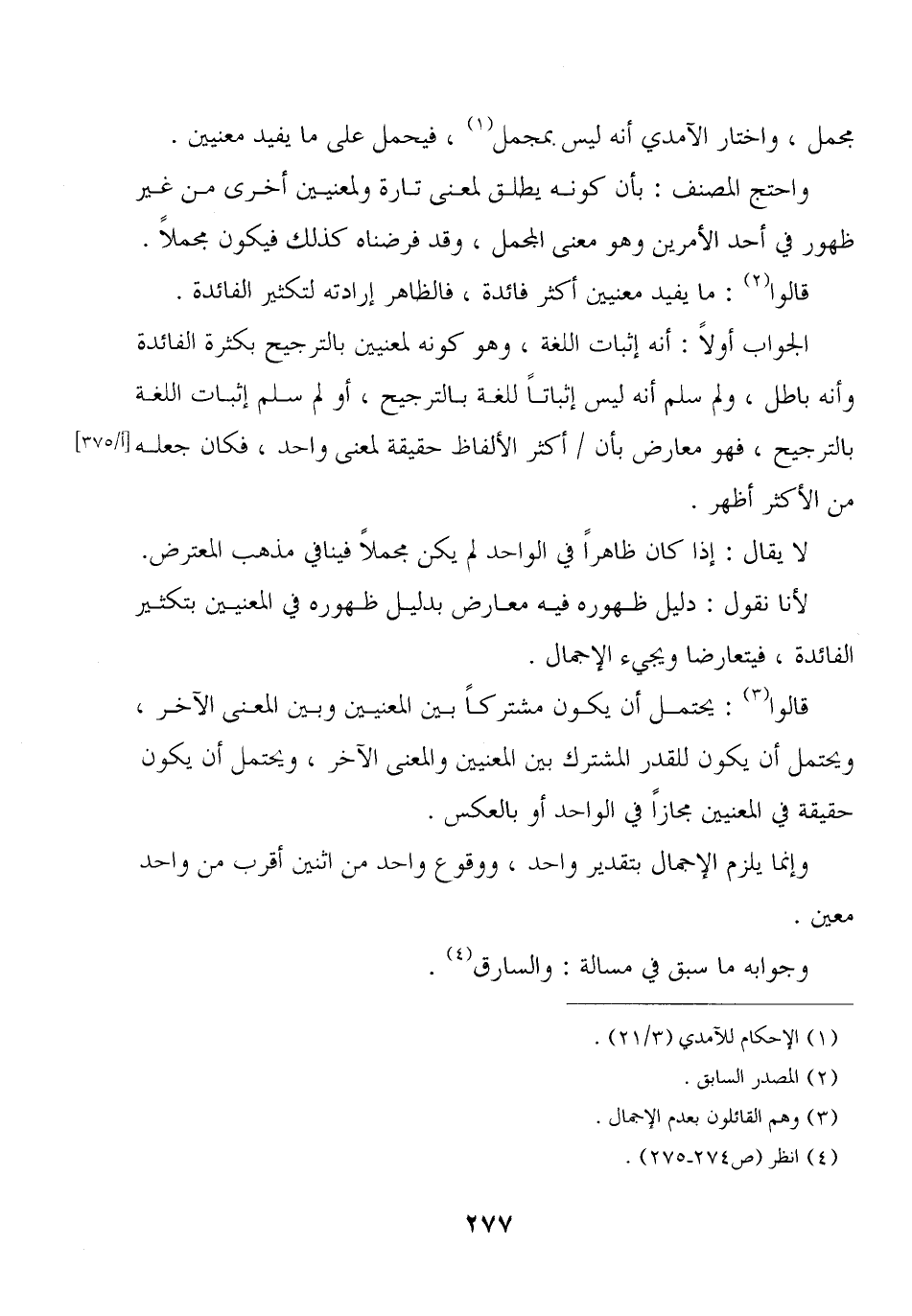 الجواب أولًا: أنه إثبات اللغة, وهو كونه لمعنيين بالترجيح بكثرة الفائدة وأنه باطل, ولم سلم أنه ليس إثباتًا للغة بالترجيح, أو لم سلم إثبات اللغة بالترجيح, فهو معارض بأن / أكثر الألفاظ حقيقة لمعنى واحد, فكان جعله من الأكثر أظهر.