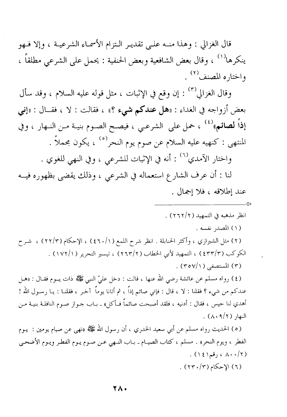 وقال الغزالي: إن وقع في الإثبات, مثل قوله عليه السلام, وقد سأل بعض أزواجه في الغداء: «هل عندكم شيء؟ » , فقالت: لا, فقال: «إني إذًا لصائم» , حمل على الشرعي, فيصح الصوم بنية من النهار, وفي المنتهى: كنهيه عليه السلام عن صوم يوم النحر, يكون مجملًا.
