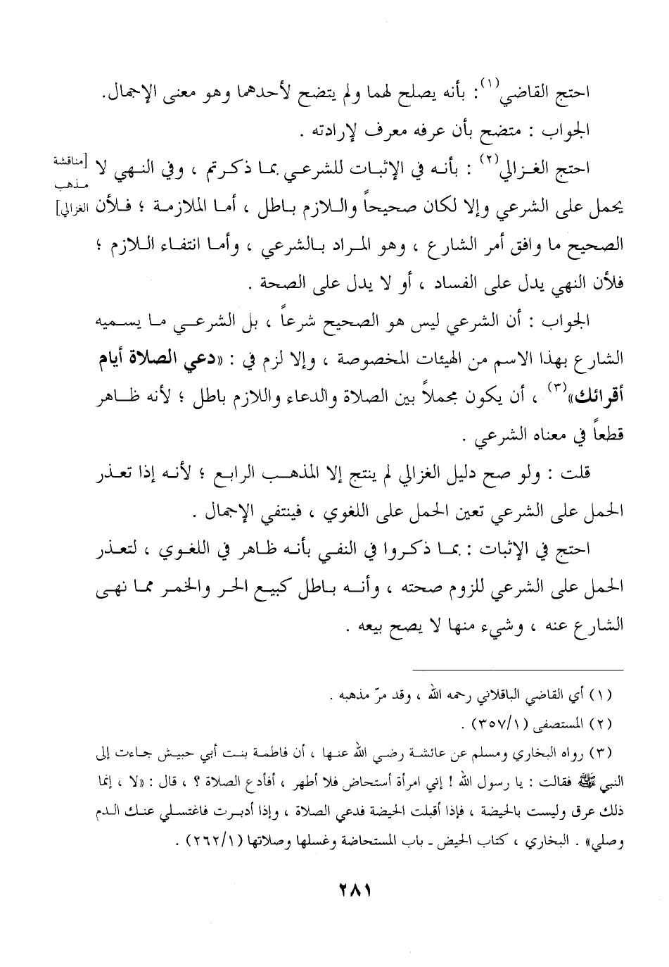 الجواب: أن الشرعي ليس هو الصحيح شرعًا, بل الشرعي ما يسميه الشارع بهذا الاسم من الهيئات المخصوصة, وإلا لزم فيه: «دعي الصلاة أيام أقرائك» , أن يكون مجملًا بين الصلاة والدعاء واللازم باطل؛ لأنه ظاهر قطعًا في معناه الشرعي.