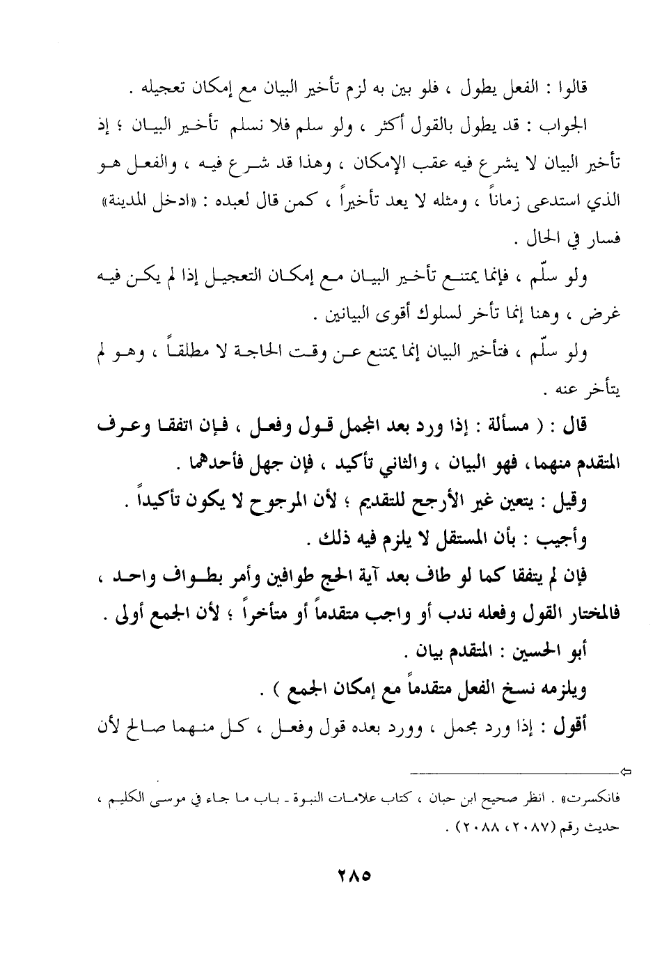الجواب: قد يطول بالقول أكثر, ولو سلم فلا نسلم تأخير البيان؛ إذ تأخير البيان لا يشرع فيه عقب الإمكان, وهذا قد شرع فيه, والفعل هو الذي استدعى زمانًا, ومثله لا يعد تأخيرًا, كمن قال لعبده: «ادخل المدينة» فسار في الحال.