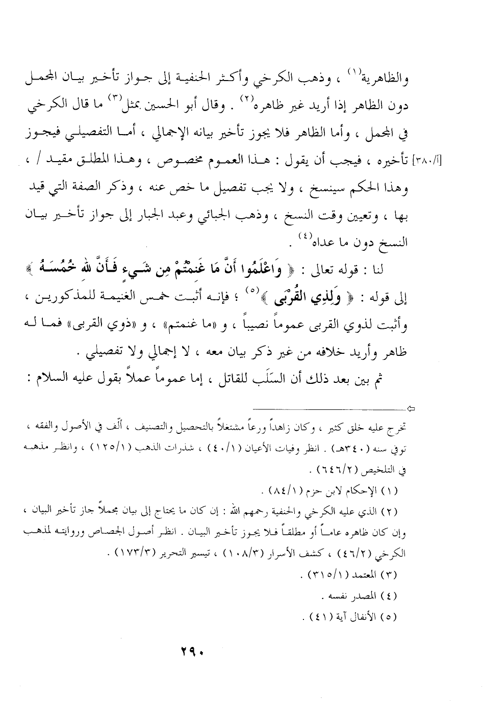 والظاهرية, وذهب الكرخي وأكثر الحنفية إلى جواز تأخير بيان المجمل دون الظاهر إذا أريد غير ظاهره. وقال أبو الحسين بمثل ما قال الكرخي في المجمل, وأما الظاهر فلا يجوز تأخير بيانه الإجمالي, أما التفصيلي فيجوز تأخيره, فيجب أن يقول: هذا العموم مخصوص, وهذا لمطلق مقيد, وهذا الحكم سينسخ, ولا يجب تفصيل ما خص عنه, وذكر الصفة التي قيد بها, وتعيين وقت النسخ, وذهب الجبائي وعبد الجبار إلى جواز تأخير بيان النسخ دون ما عداه.