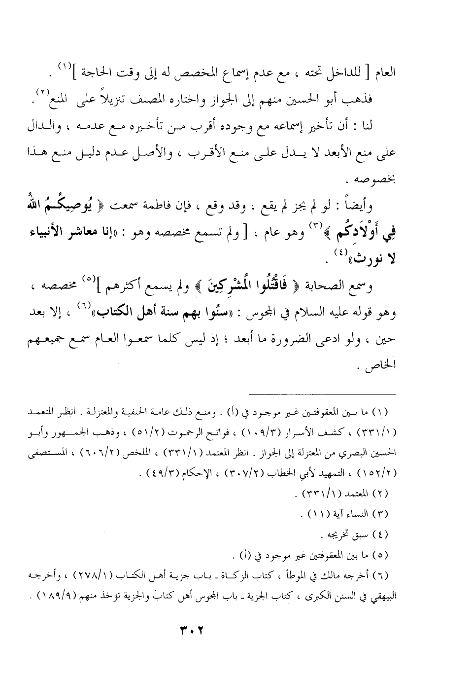 وسمع الصحابة {فاقتلوا المشركين} ولم يسمع أكثرهم] مخصصه, وهو قوله عليه السلام في المجوس: «سنوا بهم سنة أهل الكتاب» , إلا بعد حين, ولو ادعى الضرورة ما أبعد؛ إذ ليس كلما سمعوا العام سمع جميعهم الخاص.