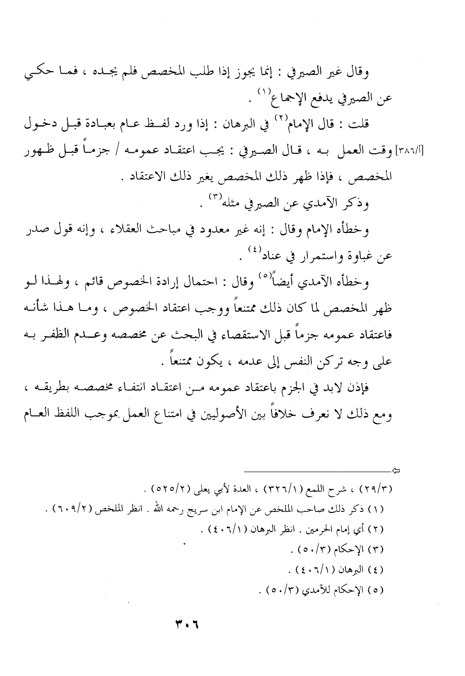 فإذن لابد في الجزم باعتقاد عمومه من اعتقاد انتفاء مخصصه بطريقه, ومع ذلك لا نعرف خلافًا بين الأصوليين في امتناع العمل بموجب اللفظ العام