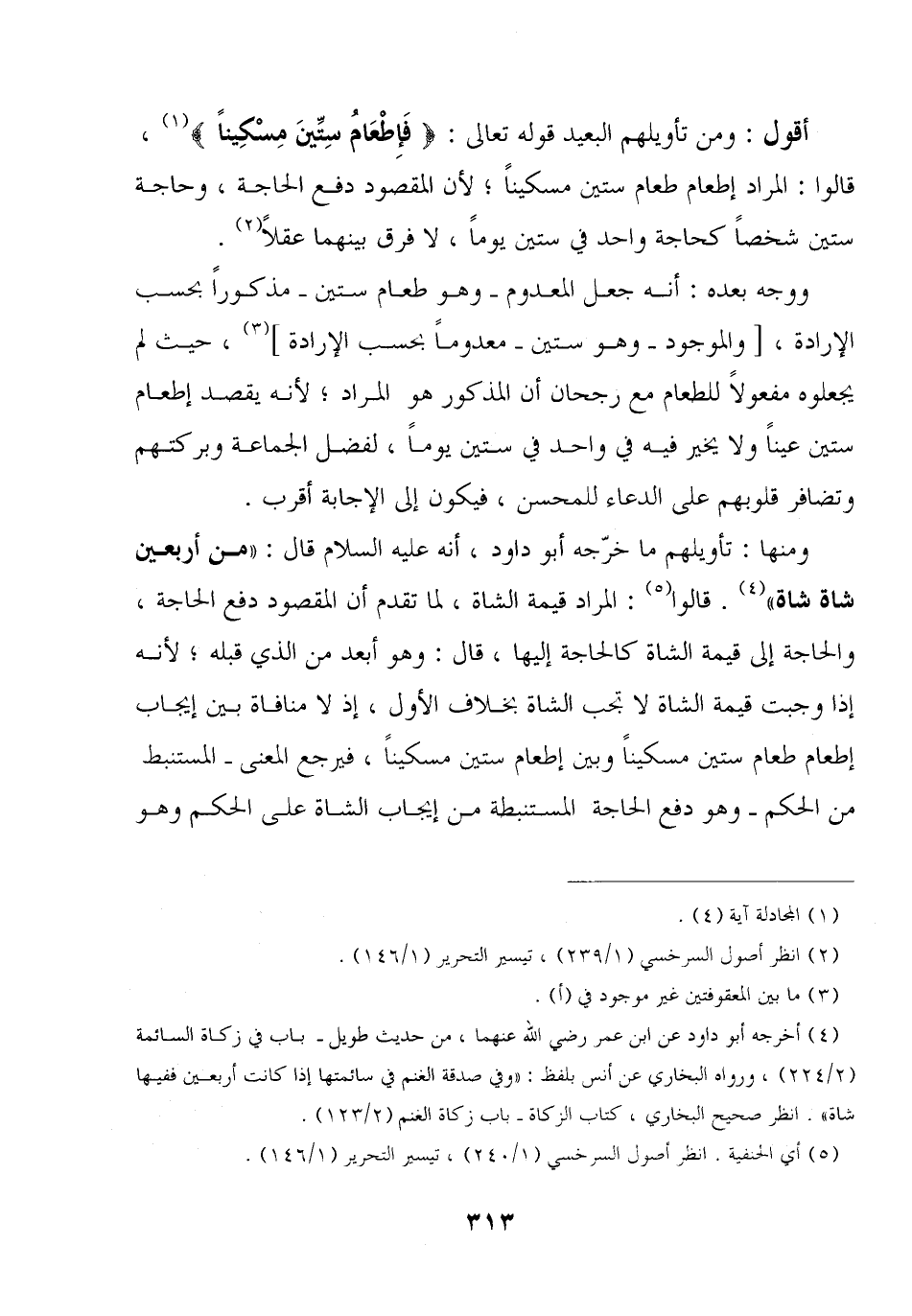 أقول: ومن تأويلهم البعيد قوله تعالى: {فإطعام ستين مسكينًا} , قالوا: المراد إطعام طعام ستين مسكينًا؛ لأن المقصود دفع الحاجة, وحاجة ستين شخصًا كحاجة واحد في ستين يومًا, لا فرق بينهما عقلًا.