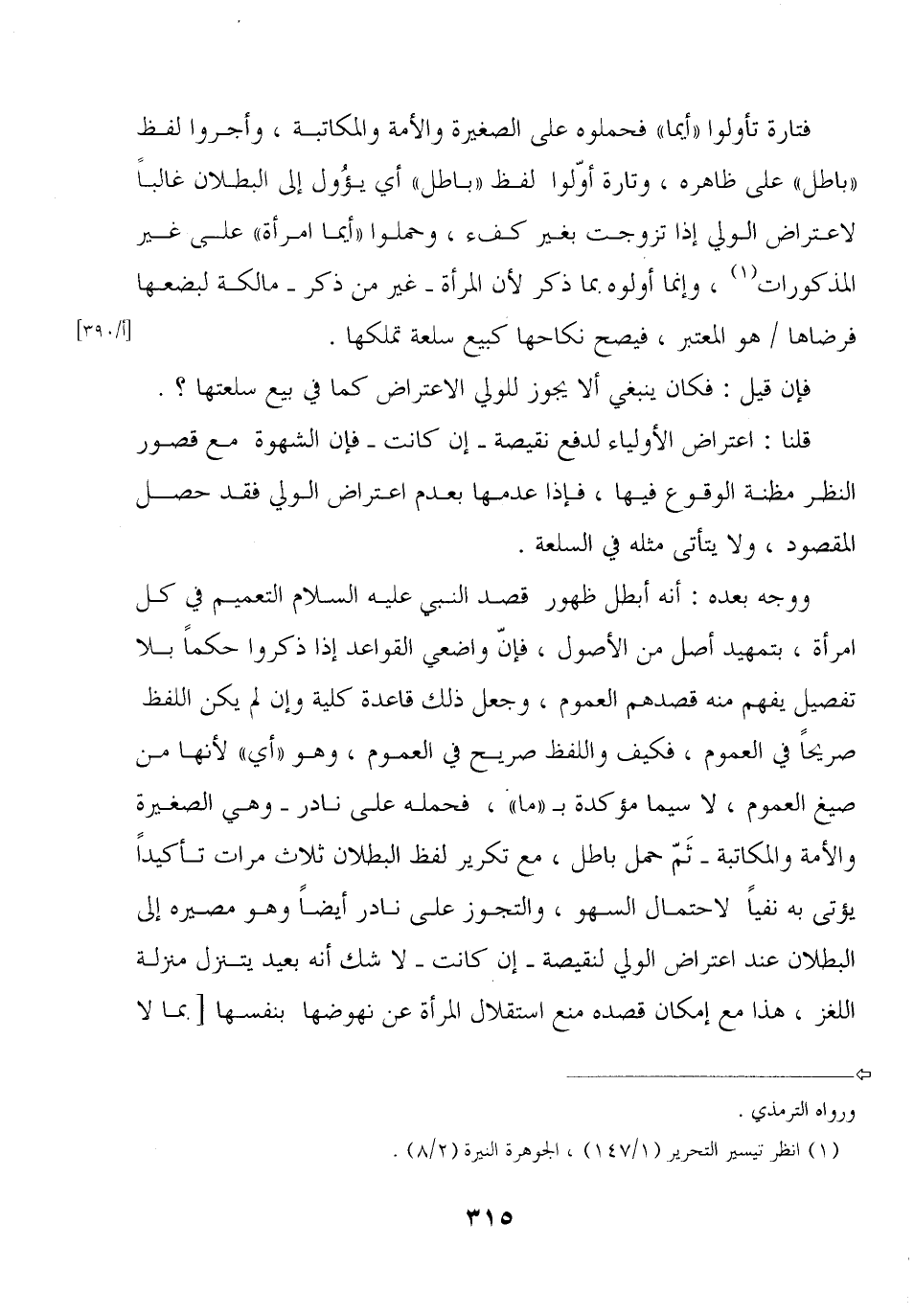 ووجه بعده: أنه أبطل ظهور قصد النبي عليه السلام التعميم في كل امرأة, بتمهيد أصل من الأصول, فإنّ واضعي القواعد إذا ذكروا حكمًا بلا تفصيل يفهم منه قصدهم العموم, وجعل ذلك قاعدة كلية وإن لم يكن اللفظ صريحًا في العموم, فكيف واللفظ صريح في العموم, وهو «أي» لأنها من صيغ العموم, لا سيما مؤكدة بـ «ما» , فحمله على نادر - وهي الصغيرة والأمة والمكاتبة - ثَمّ حمل باطل, مع تكرير لفظ ثلاث مرات تأكيدًا يؤتى به نفيًا لاحتمال السهو, والتجوز على نادر أيضًا وهومصيره إلى البطلان عند اعتراض الولي لنقيصة - إن كانت - لا شك أنه بعيد يتنزل منزلة اللغز, هذا مع إمكان قصده منع استقلال المرأة عن نهوضها بنفسها [بما لا