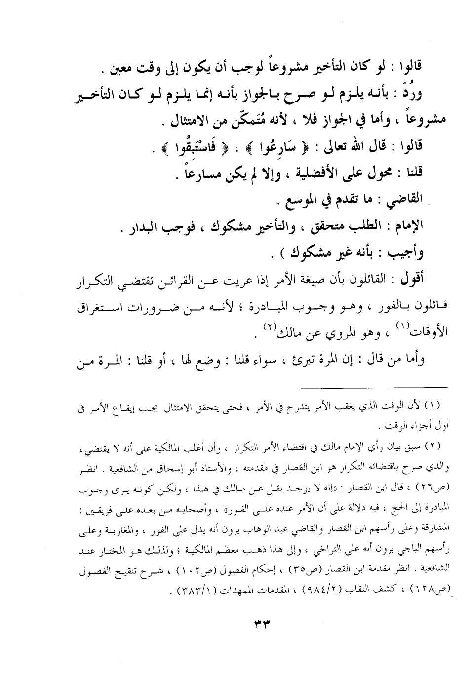 أقول: القائلون بأن صيغة الأمر إذا عريت عن القرائن تقتضي التكرار قائلون بالفور, وهو وجوب المبادرة؛ لأنه من ضرورات استغراق الأوقات, وهو المروي عن مالك.