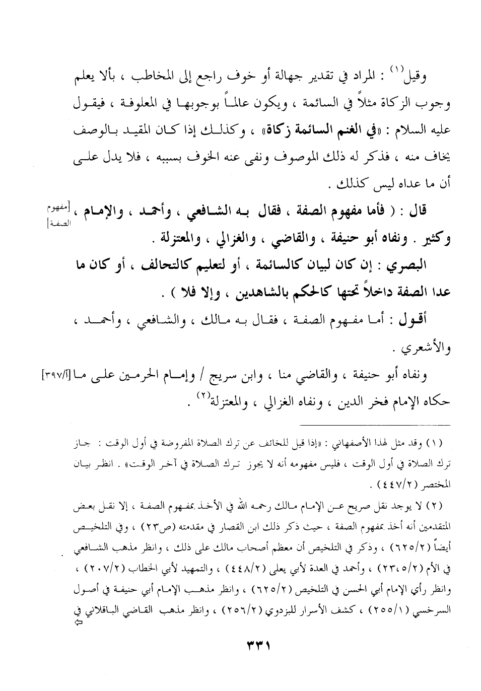 قال: (فأما مفهوم الصفة, فقال به الشافعي, وأحمد, والإمام, وكثير. ونفاه أبو حنيفة, والقاضي, والغزالي, والمعتزلة.