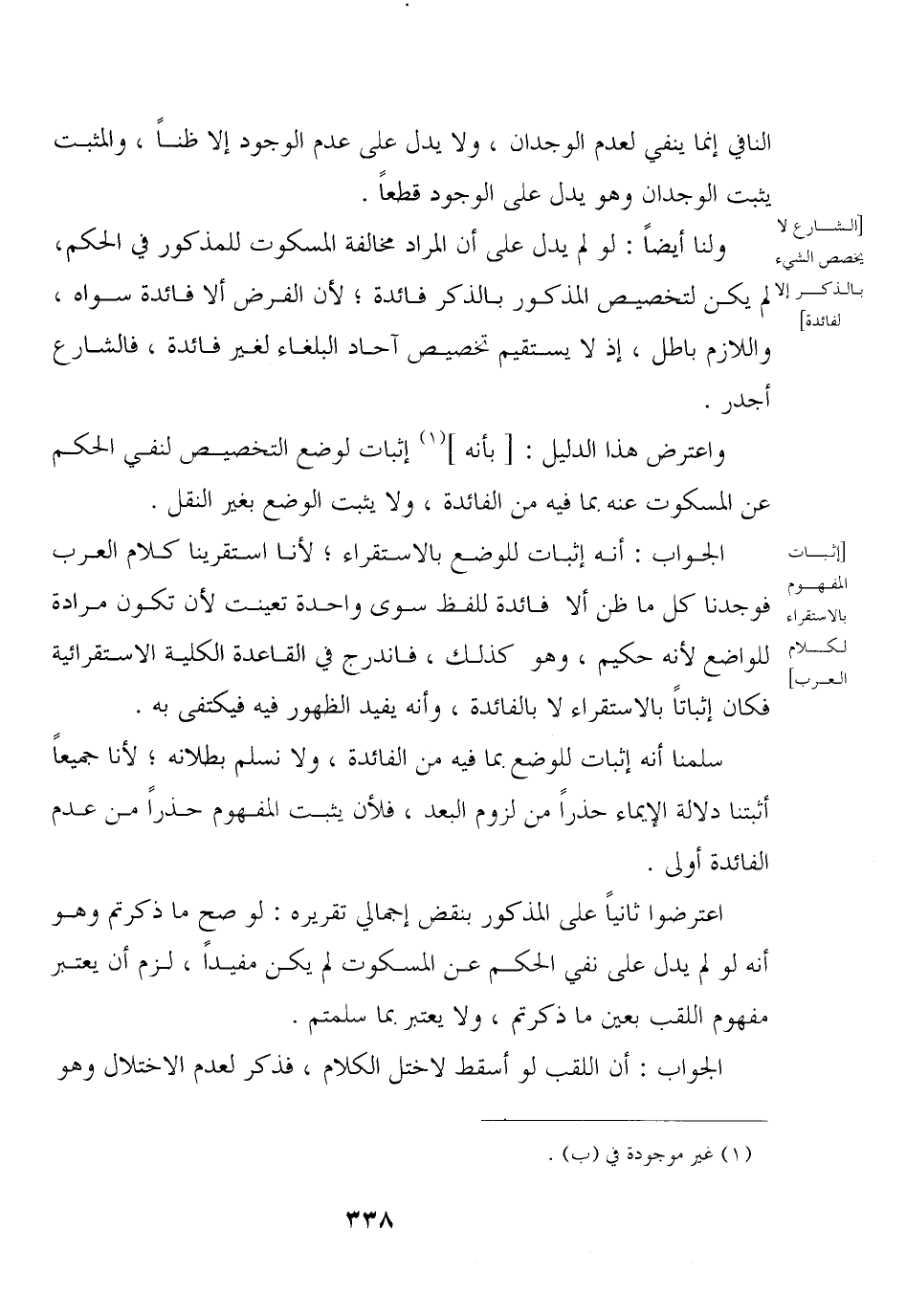 ولنا أيضًا: لو لم يدل على أن المراد مخالفة المسكوت للمذكور في الحكم, لم يمكن لتخصيص المذكور بالذكر فائدة؛ لأن الفرض ألا فائدة سواه, واللازم باطل, إذ لا يستقيم تخصيص آحاد البلغاء لغير فائدة, فالشارع أجدر.