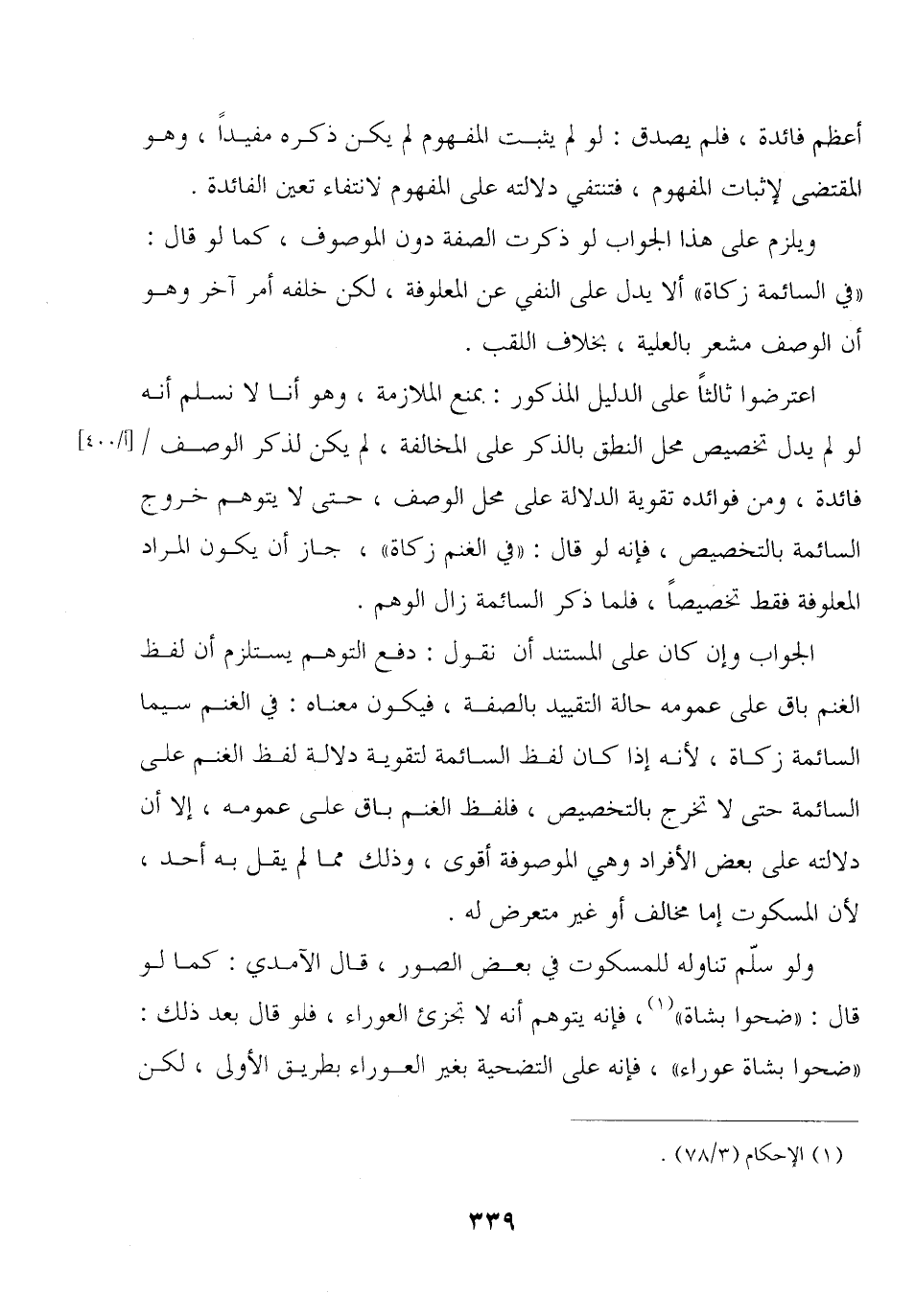 ويلزم على هذا الجواب لو ذكرت الصفة دون الموصوف, كما لو قال: «في السائمة زكاة» ألا يدل على النفي عن المعلوفة, لكن خلفه أمر آخر وهو أن الوصف مشعر بالعلية, بخلاف اللقب.