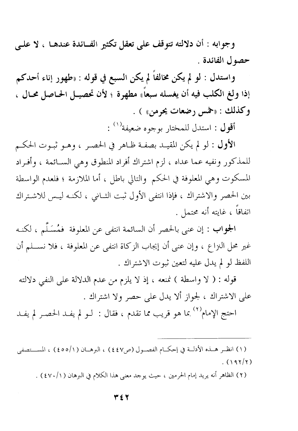 الجواب: إن عنى بالحصر أن السائمة انتفى عن المعلوفة فمُسَلَّم, لكنه غير محل النزاع, وإن عنى أن إيجاب الزكاة انتفى عن المعلوفة, فلا نسلم أن اللفظ لو لم يدل عليه لتعين ثبوت الاشتراك.