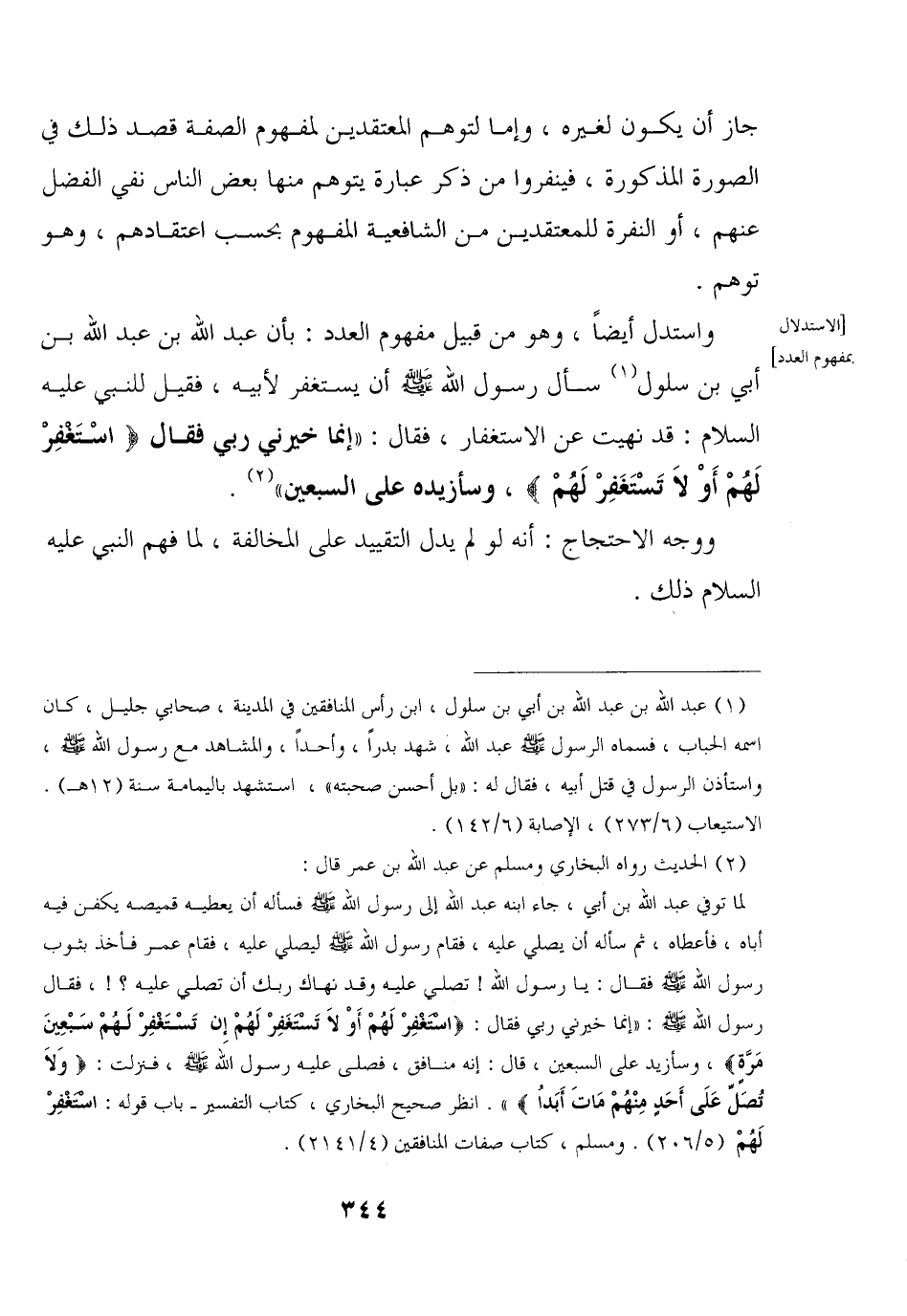 واستدل أيضًا, وهو من قبيل مفهوم العدد: بأن عبد الله بن عبد الله بن أبي بن سلول سأل رسول الله صلى الله عليه وسلم أن يستغفر لأبيه, فقيل للنبي عليه السلام: قد نهيت عن الاستغفار, فقال: «إنما خيرني ربي فقال {استغفر لهم أو لا تستغفر لهم} , وسأزيده على السبعين».