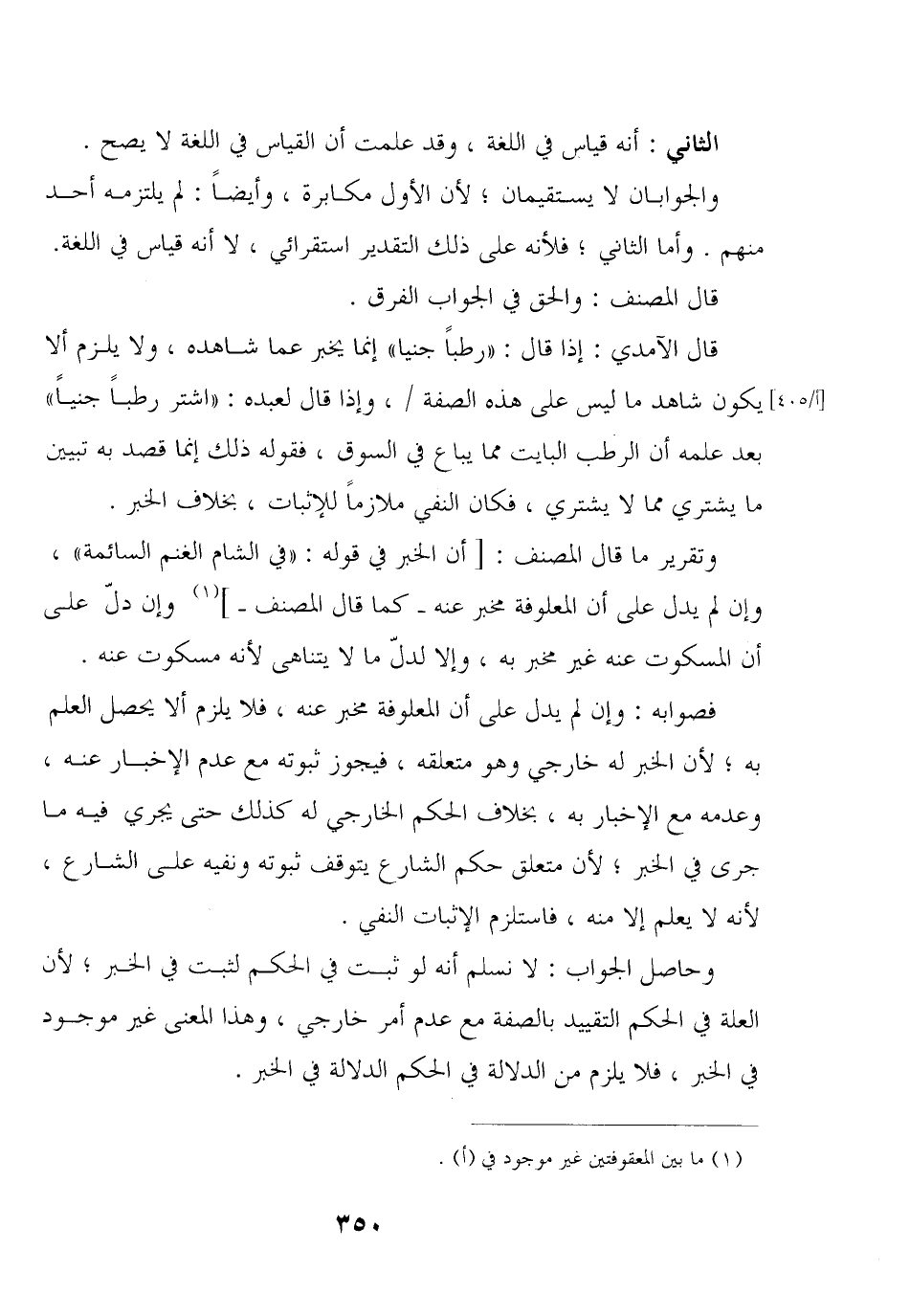 وتقرير ما قال المصنف: [أن الخبر في قوله: «في الشام الغنم السائمة» , وإن لم يدل على أن المعلوفة مخبر عنه - كما قال المصنف -] وإن دلّ على أن المسكوت عنه غير مخبر به, وإلا لدلّ ما لا يتناهى لأنه مسكوت عنه.