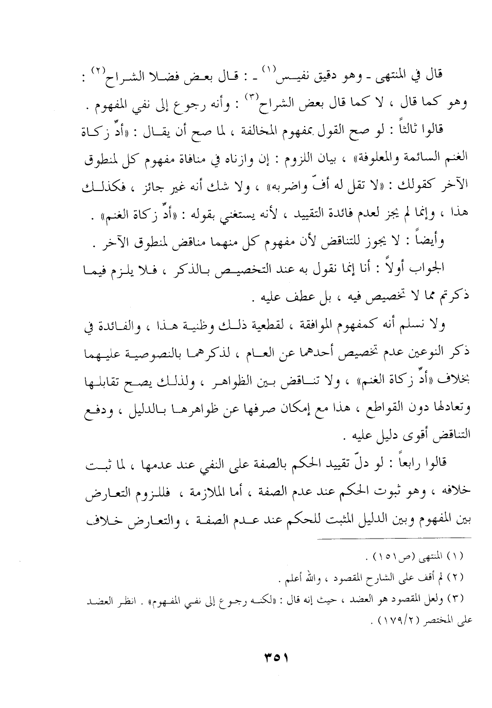 قال في المنتهى - وهو دقيق نفيس -: قال بعض فضلا الشراح: وهو كما قال, لا كما قال بعض الشراح: وأنه رجوع إلى نفي المفهوم.