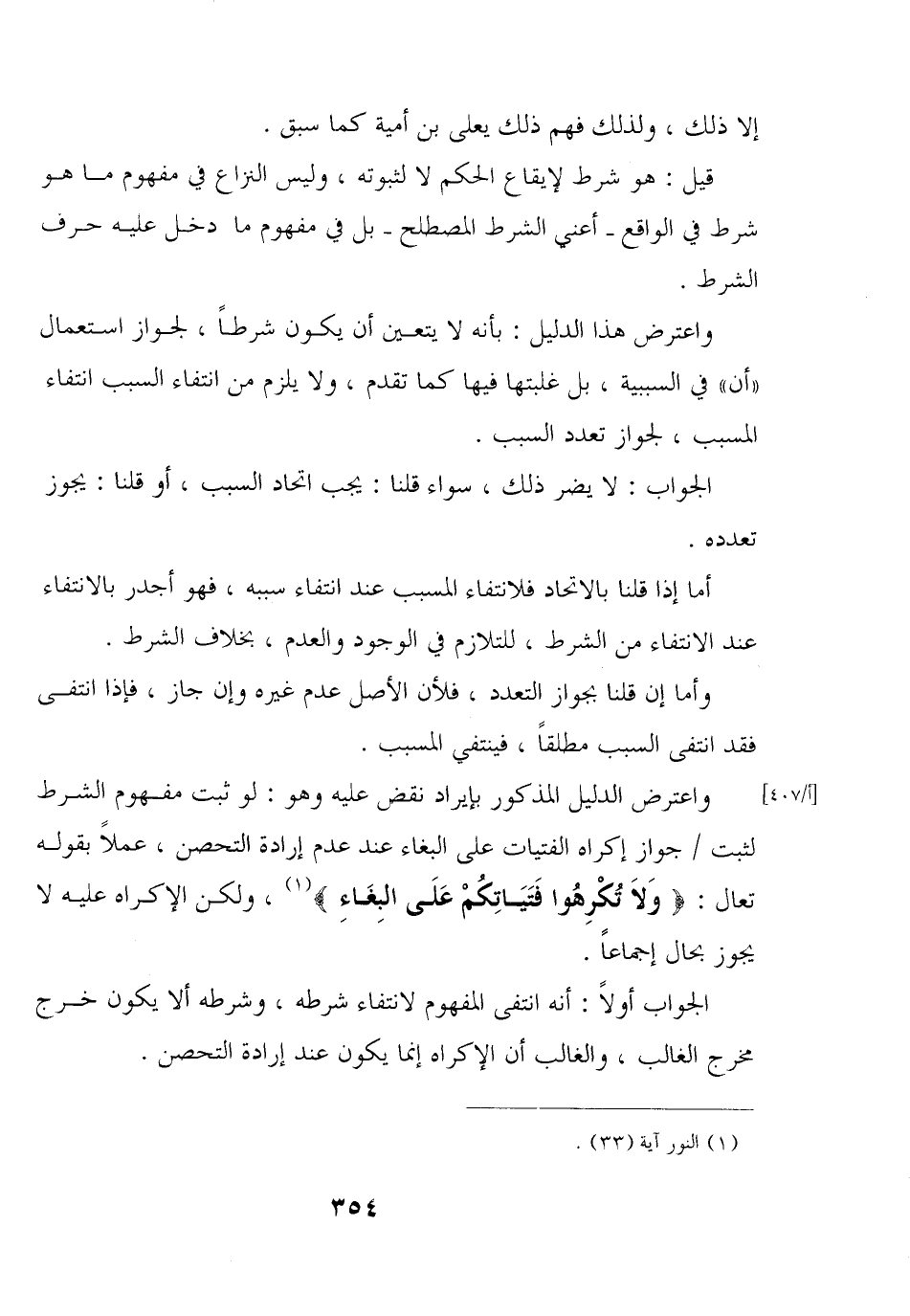 واعترض الدليل المذكور بإيراد نقض عليه وهو: لو ثبت مفهوم الشرط لثبت / جواز إكراه الفتيات على البغاء عند عدم إرادة التحصن, عملًا بقوله تعالى: {ولا تكرهوا فتياتكم على البغاء} , ولكن الإكراه عليه لا يجوز بحال إجماعًا.
