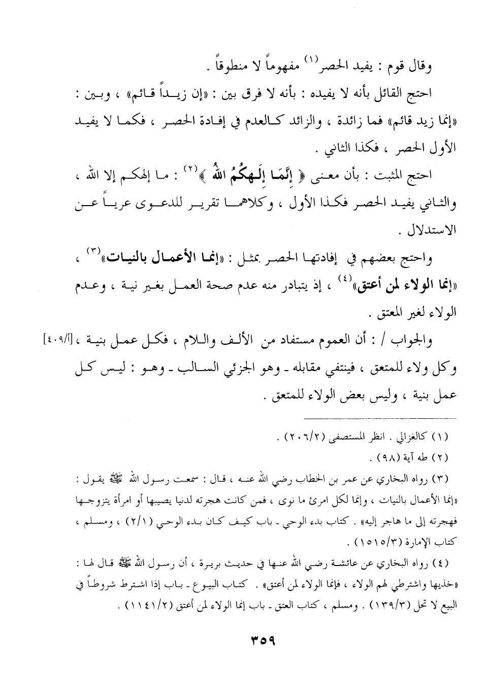 واحتج بعضهم في إفادتهم الحصر بمثل: «إنما الأعمال بالنيات» , «إنما الولاء لمن أعتق» , إذ يتبادر منه عدم صحة العمل بغير نية, وعدم الولاء لغير المعتق.