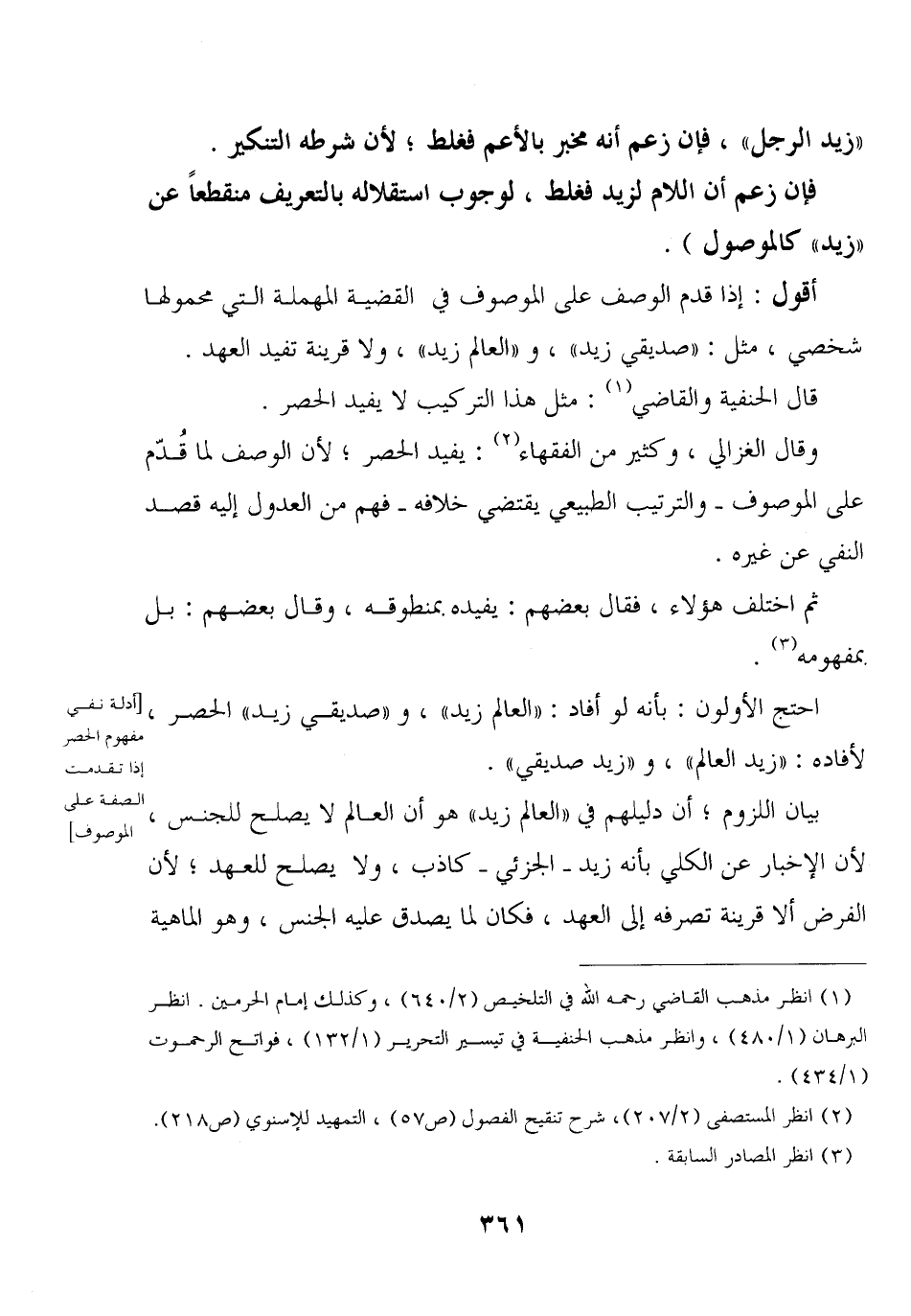 وقال الغزالي, وكثير من الفقهاء: يفيد الحصر؛ لأن الوصف لما قُدّم على الموصوف - والترتيب الطبيعي يقتضي خلافه - فهم من العدول إليه قصد النفي عن غيره.