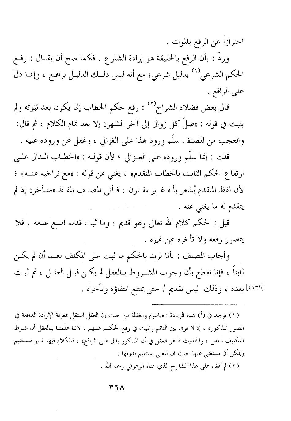 قلت: إنما سلّم وروده على الغزالي؛ لأن قوله: «الخطاب الدال على ارتفاع الحكم الثابت بالخطاب المتقدم» , يغني عن قوله: «مع تراخيه عنه»؛ لأن لفظ المتقدم يُشعر بأنه غير مقارن, فأتى المصنف بلفظ «متأخر» إذ لم يتقدم له ما يغني عنه.