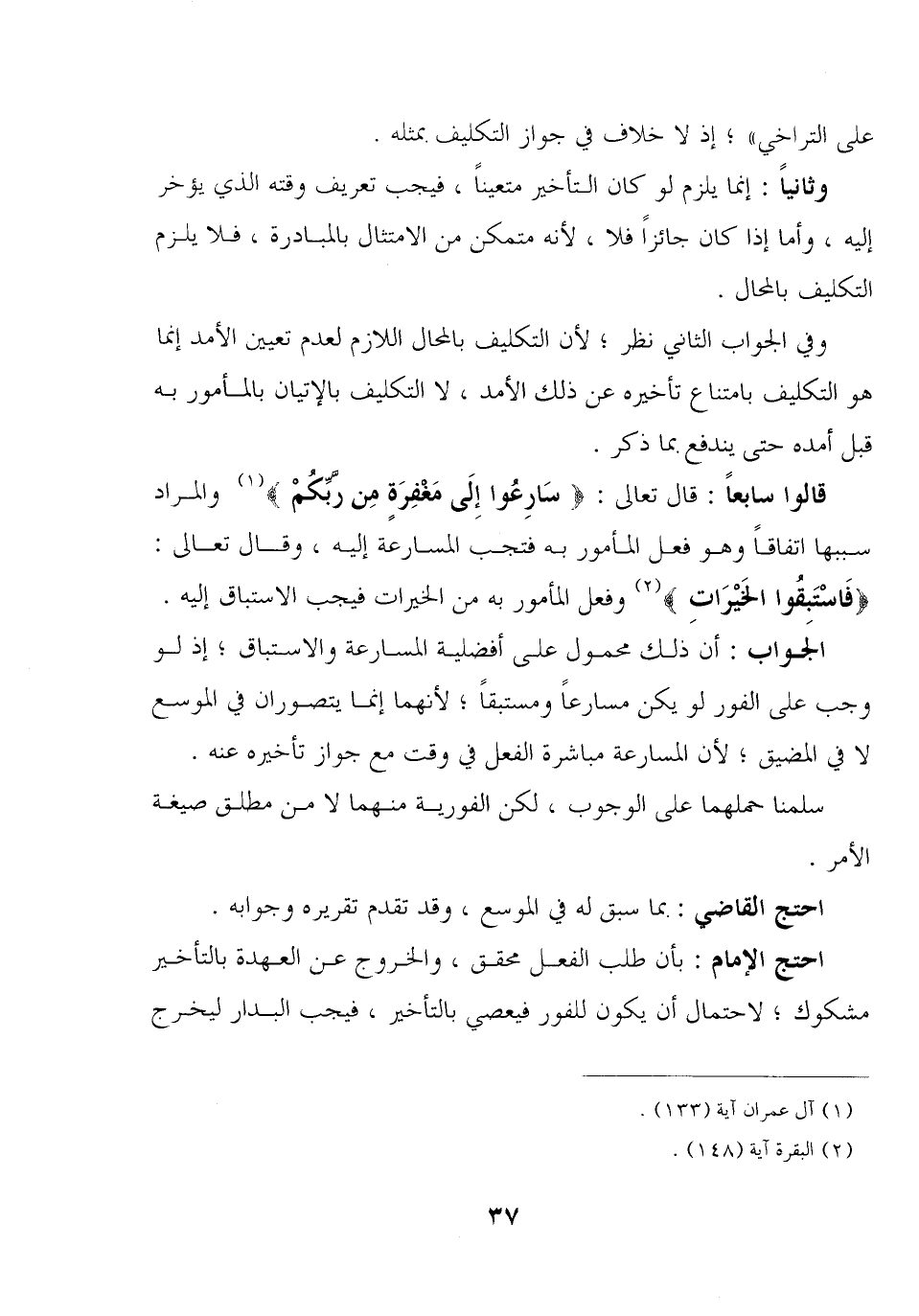 قالوا سابعًا: قال تعالى: {سارعوا إلى مغفرة من ربكم} والمراد سببها اتفاقًا وهو فعل المأمور به فتجب المسارعة إليه, وقال تعالى: {فاستبقوا الخيرات} وفعل المأمور به من الخيرات فيجب الاستباق إليه.