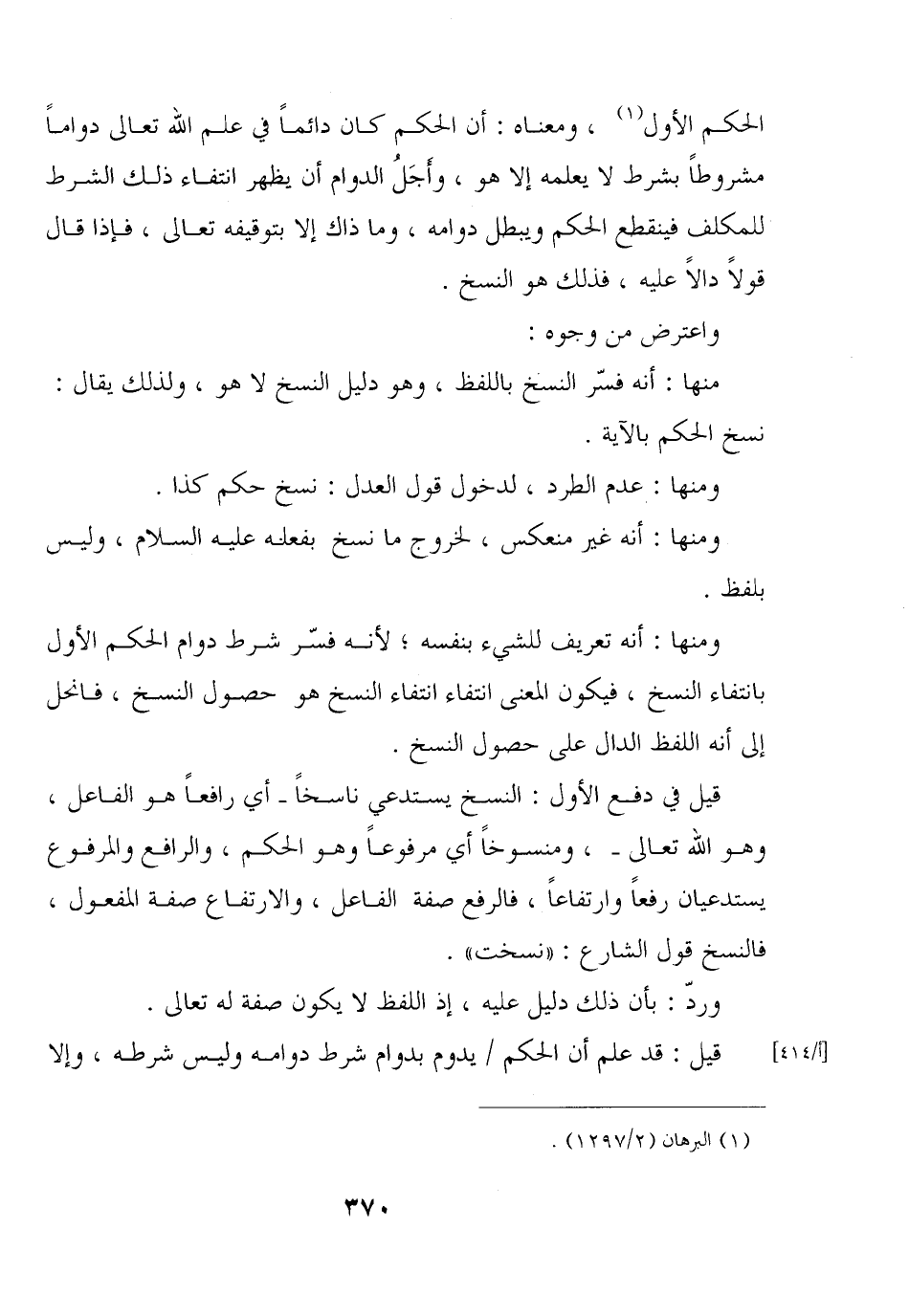 ومنها: أنه تعريف للشيء بنفسه؛ لأنه فسّر شرط دوام الحكم الأول بانتفاء النسخ, فيكون المعنى انتفاء انتفاء النسخ هو حصول النسخ, فانحل إلى أنه اللفظ الدال على حصول النسخ.