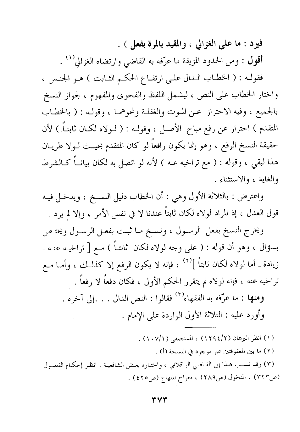 فيرد: ما على الغزالي, والمقيد بالمرة بفعل).