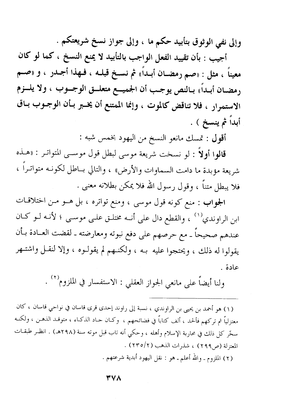 أجيب: بأن تقييد الفعل الواجب بالتأبيد لا يمنع النسخ, كما لو كان معينًا, مثل: «صم رمضان أبدًا» ثم نسخ قبله, فهذا أجدر, و «صم رمضان أبدًا» بالنص يوجب أن الجميع متعلق الوجوب, ولا يلزم الاستمرار, فلا تناقض كالموت, وإنما الممتنع أن يخبر بأن الوجوب باق أبدًا ثم ينسخ).