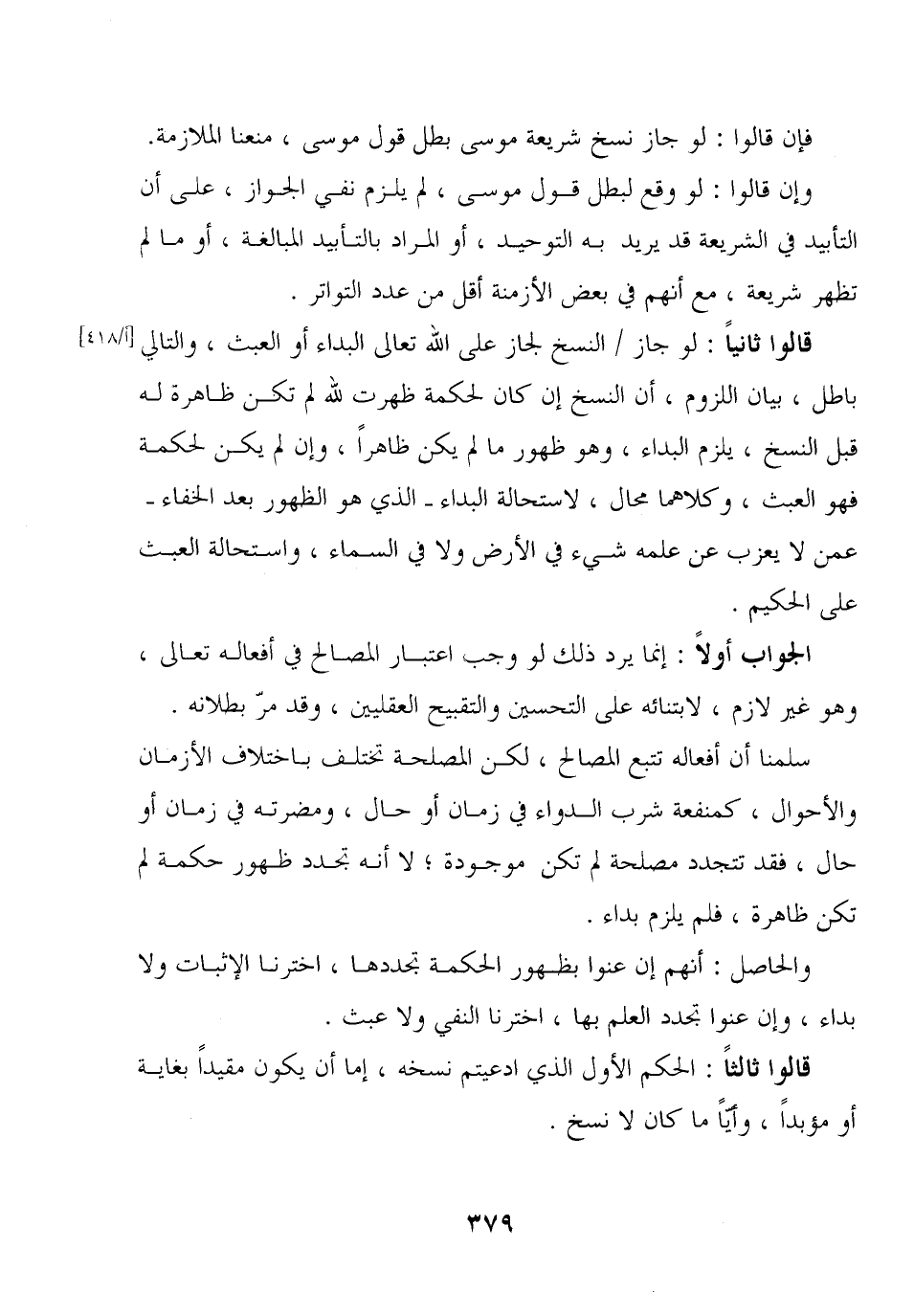 قالوا ثنايًا: لو جاز / النسخ لجاز على الله تعالى البداء أو العبث, والتالي باطل, بيان اللزوم, أن النسخ إن كان لحكمة ظهرت لله لم تكن ظاهرة له قبل النسخ, يلزم البداء, وهو ظهور ما لم يكن ظاهرًا, وإن لم يكن لحكمة فهو العبث, وكلاهما محال, لاستحالة البداء - الذي هو الظهور بعد الخفاء - عمن لا يعزب عن علمه شيء في الأرض ولا في السماء, واستحالة العبث على الحكيم.